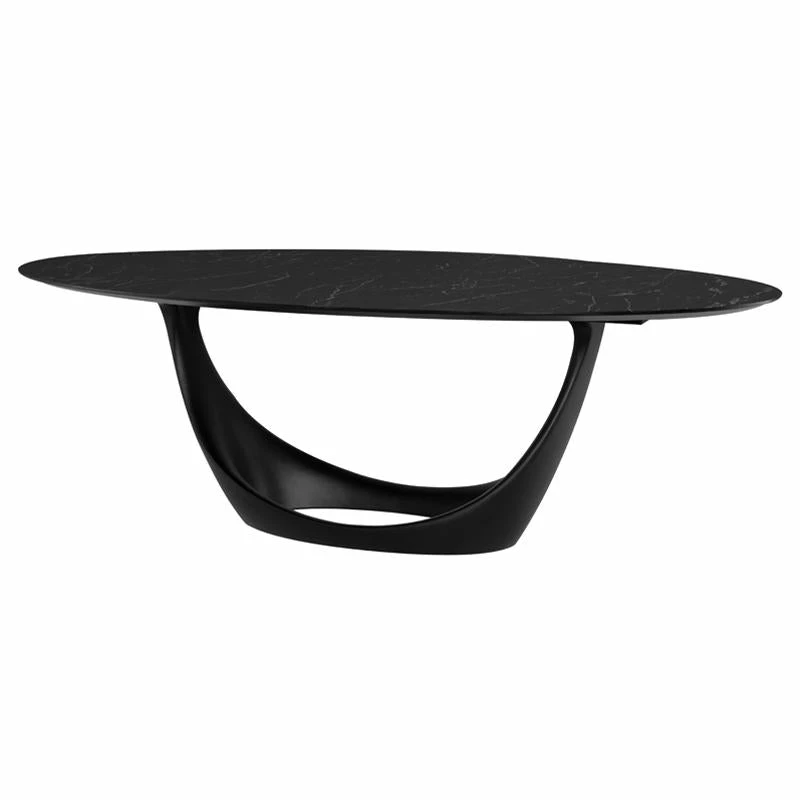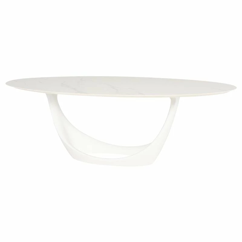 The sculptural base of the Montana dining table is unique and intriguing. Its smooth lines and minimalist curves create a refined drama that is perfectly balanced by the ceramic oval top. Pair with equally artful chairs for a dynamic dining space.