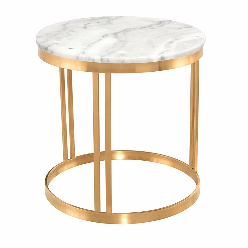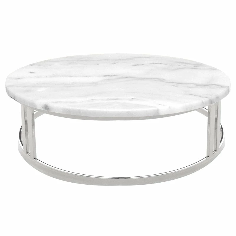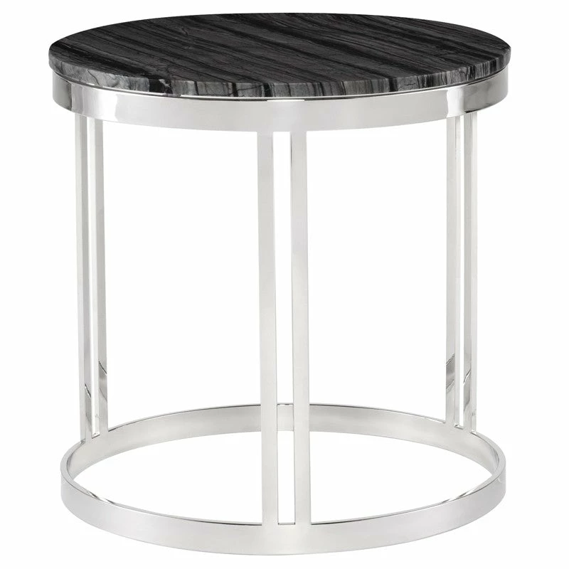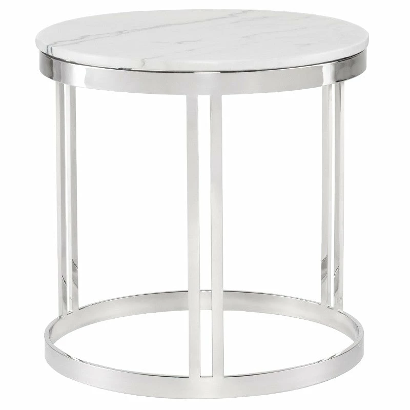 The Nicola side table finds balance and symmetry in the repetition of the round. A perfect circle of marble rests atop two elegant circumferences of stainless steel with doubled steel supports. The Nicolas minimalist design is striking for its simple formal elegance.