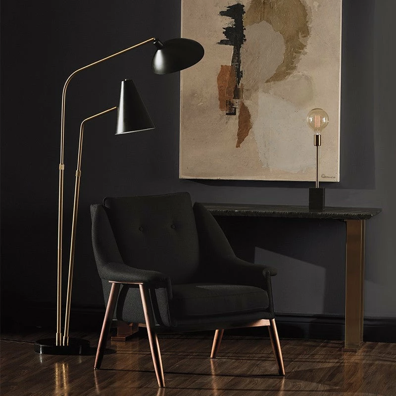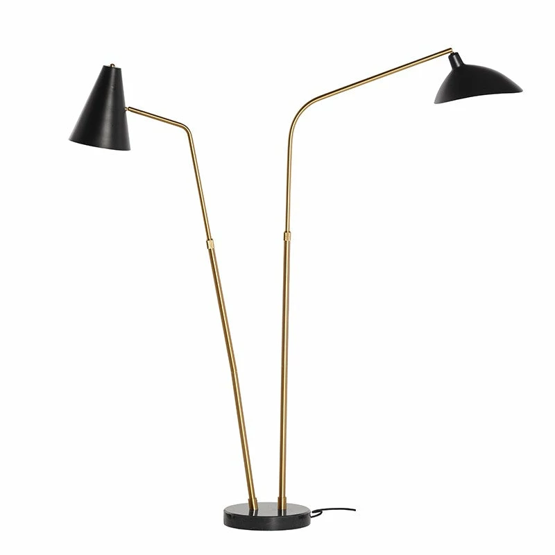 The Dominique floor light employs dual light sources, a practical design aesthetic that is both sleek and spatially functional. Stylistically contrasting polished black shades attach to brushed gold tubing and a polished black marble base, the style is both unique and elegantly urbane.