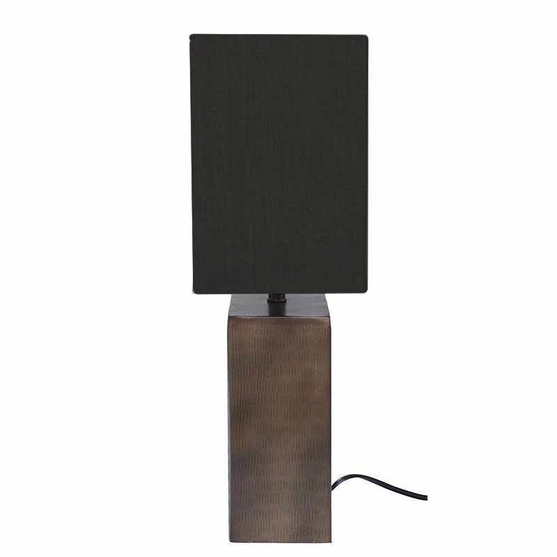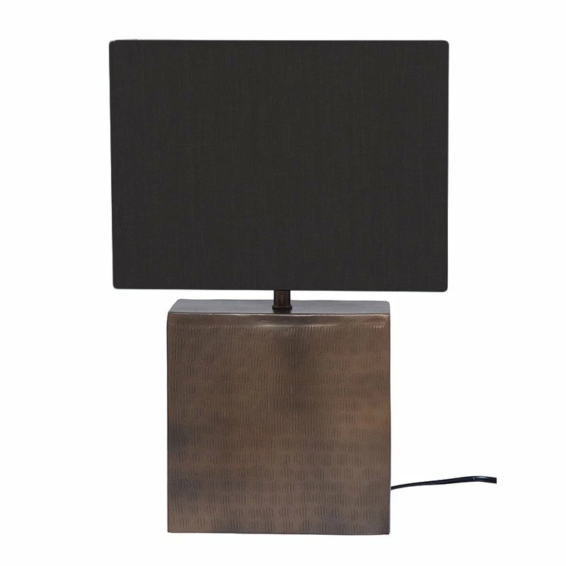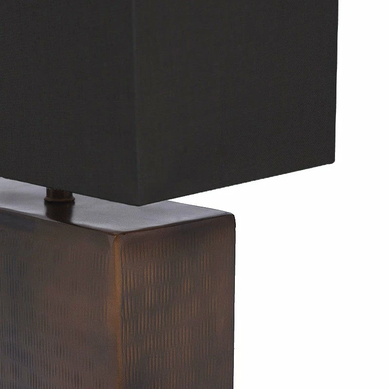 The squared matte brass table light features subtle etched detailing, paired with a rectangular fabric shade in black drawing together fluid repetitions of form and texture.