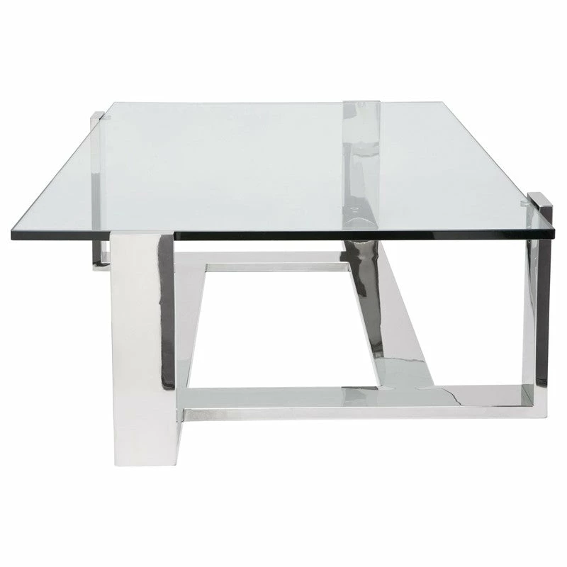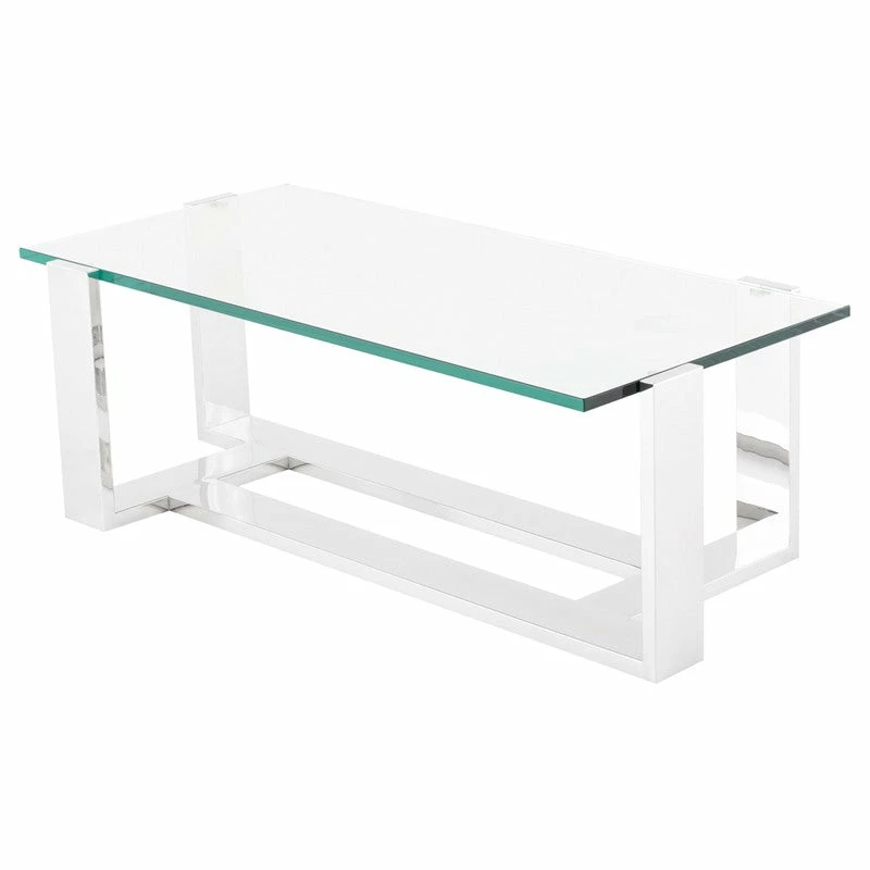 The Flynn coffee table projects an air of lightness and grace inspired by early 20th century linear modernism. The asymmetrical frame crafted in high polish stainless steel gently supports an inlaid glass table top resting seamlessly on four sleek, refined legs. 62 inches x 42 inches.