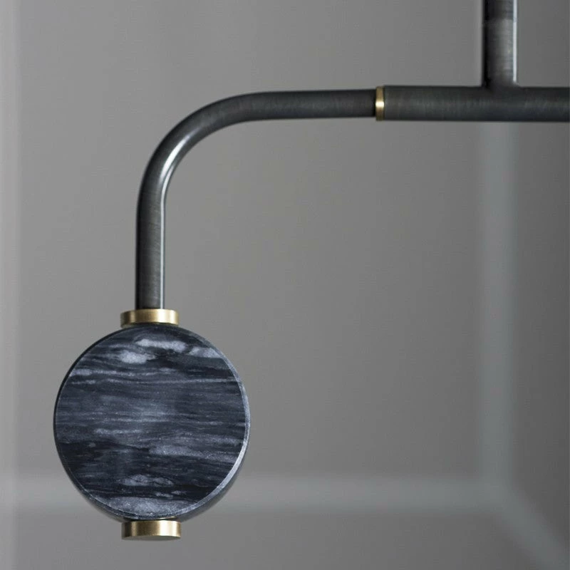 Structure meets flow. An elegant free form of mixed materials and design inspires a distinctively unique pendant. Mixed metals crafted in blackened steel and brass juxtapose an innovative marble counter balance bringing harmony to form.