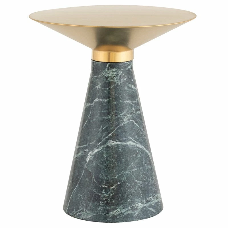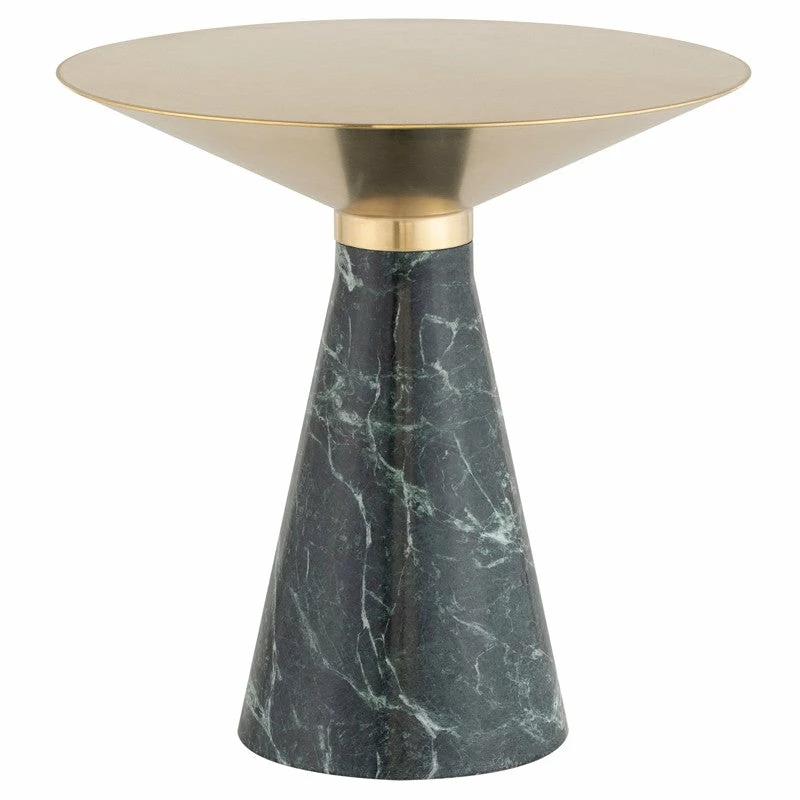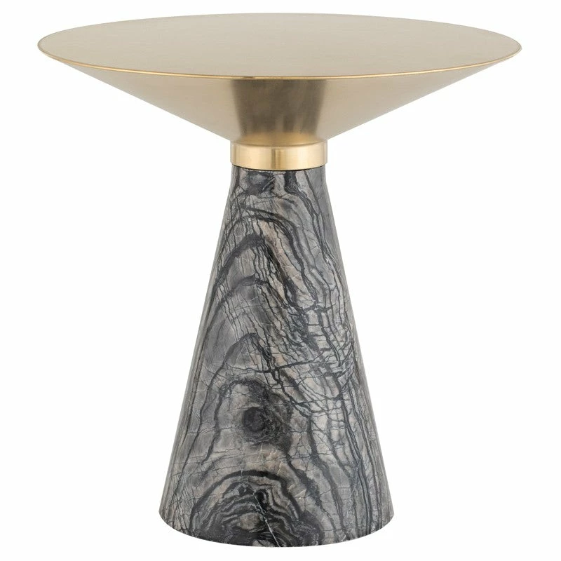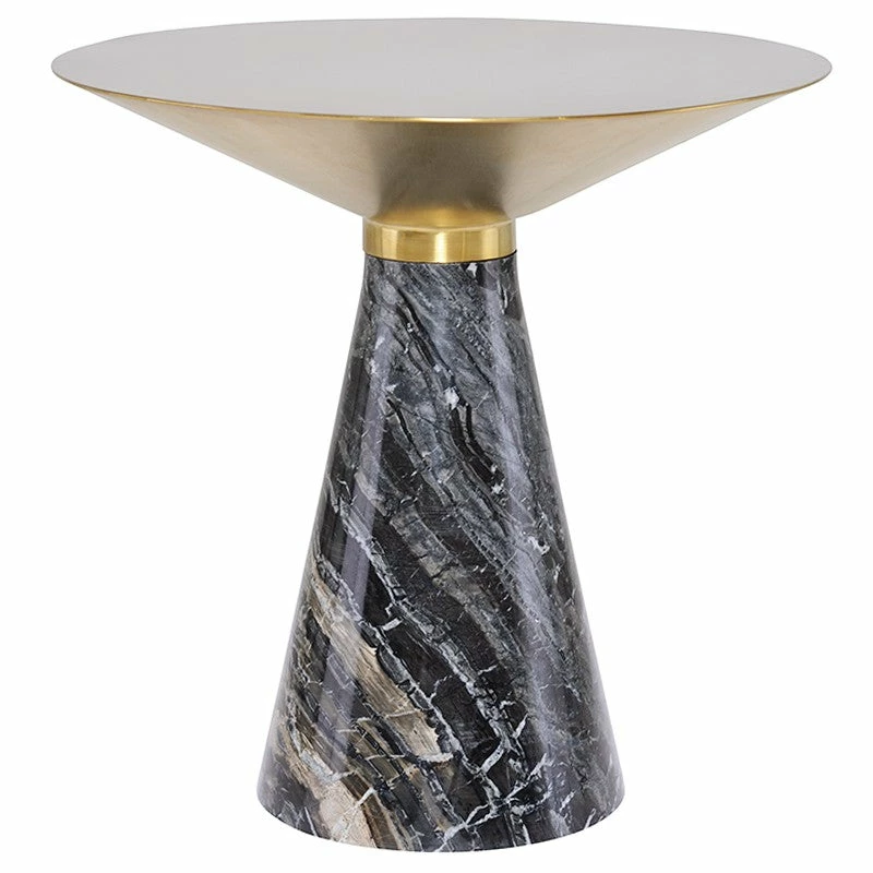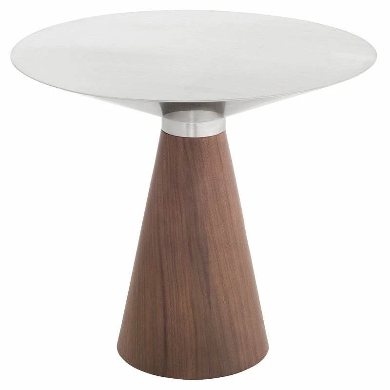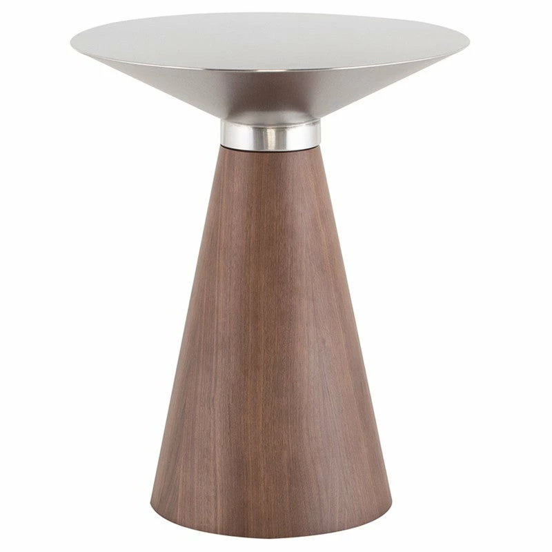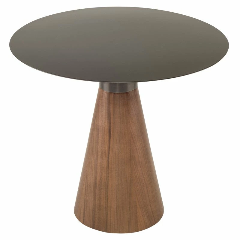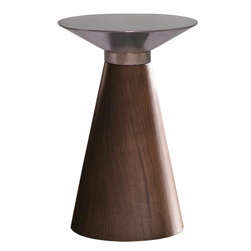 The Iris side table is a testament to pure, timeless architectural form. A brushed gold surface securely fashioned to a rich walnut veneer base creates a striking juxtaposition in detailing and mixed materials.