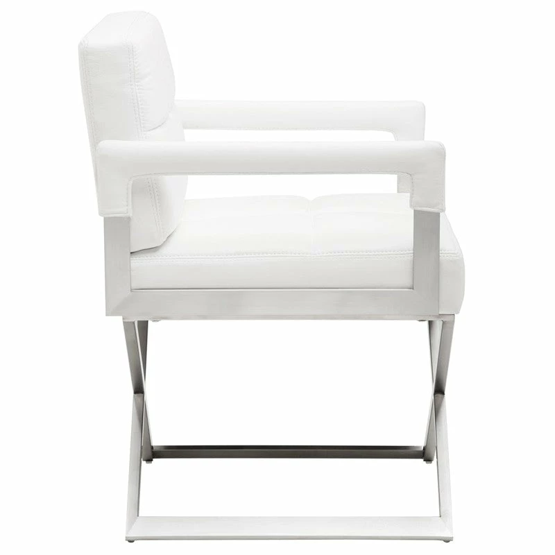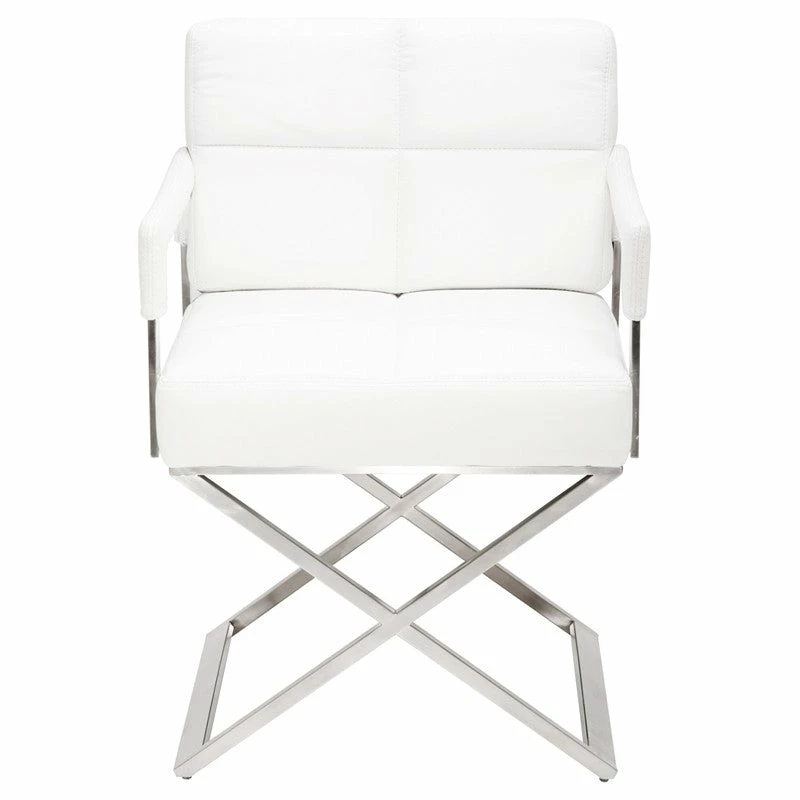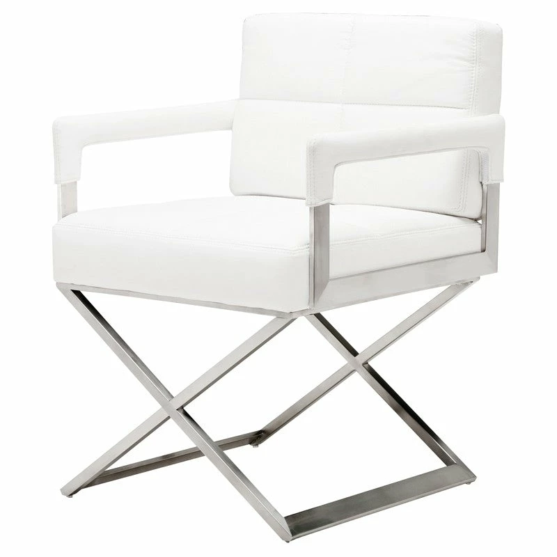 The Jack dining chair takes inspiration from the classic directors chair aesthetic, incorporating comfort with elegant design. Defining the piece, a brushed stainless steel frame with flattened steel arms. Finished in densely padded, brilliant white Naugahyde upholstery, the Jack dining chair embraces the essence of contemporary style.