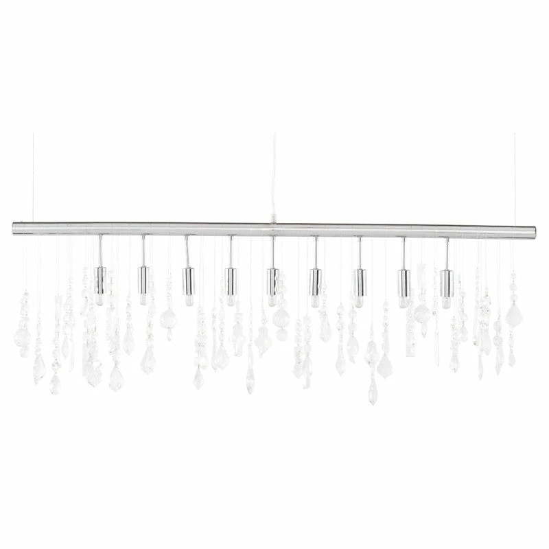 The Crystal linear pendant combines contemporary streamlined elegance with an eclectic range of assorted crystals creating a dynamic sophisticated aesthetic. The linear profile of the Crystal pendant is suitable for installation over bars and counters enhancing spatial definition. The Crystal linear includes a chromed steel canopy and fixtures, stainless steel suspension wires and 38 assorted crystals. Every crystal hook can be individually hung arranged and composed to suite the singular creative aesthetic of each and every owner.