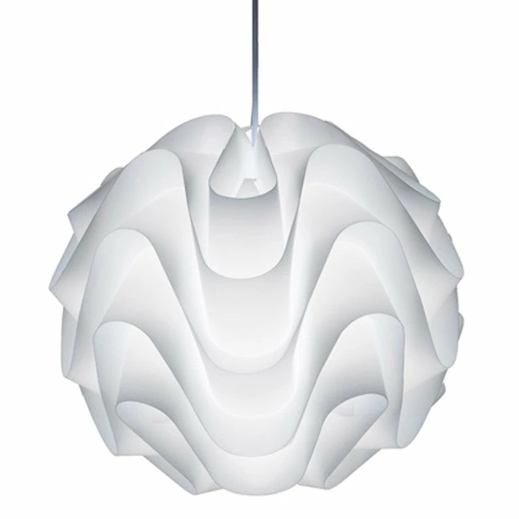 Rhythmic sculpted waves characterize the hypnotic merangue pendant. Casting an inviting glow in corrugated polypropylene and brilliant chromed steel the merangue projects a unique organic warmth and grace. The Merangue has a color matched power cord and chromed steel canopy. The pendant is offered in two sizes 17 inches and 26 inches.