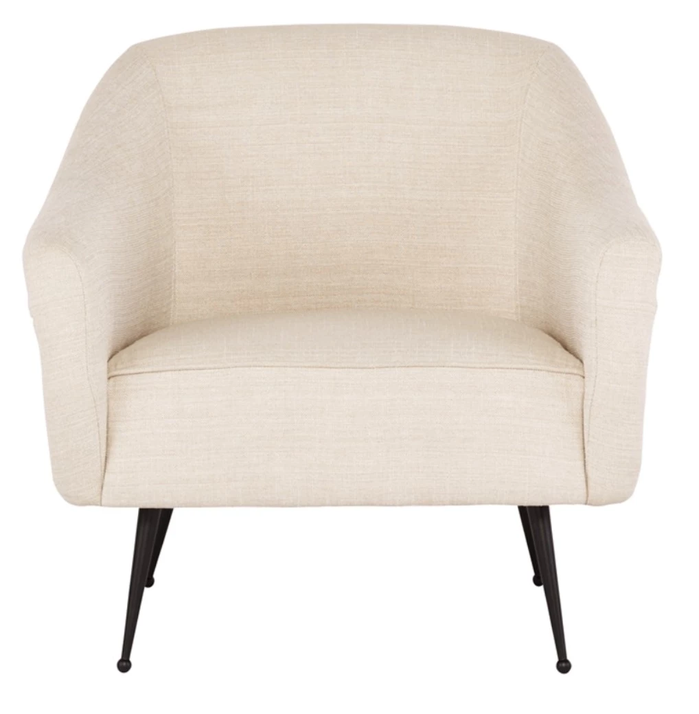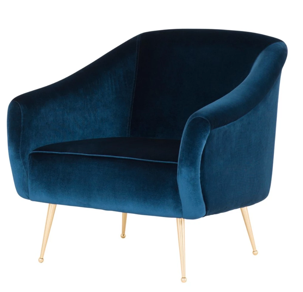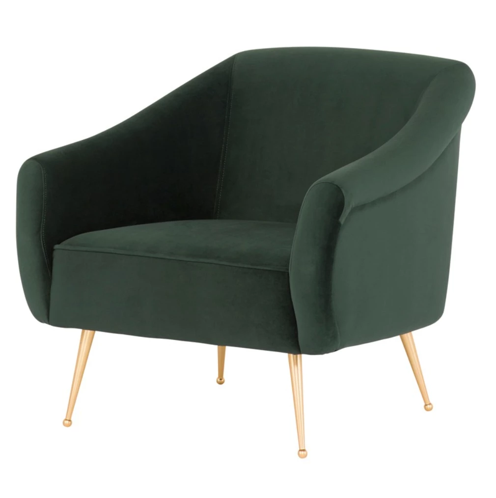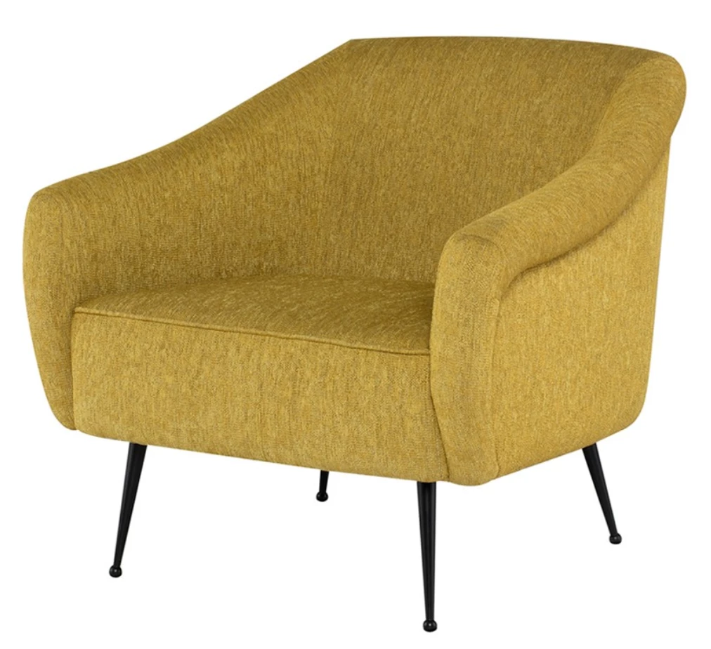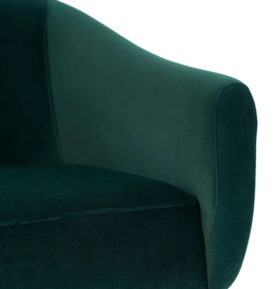The Lucie occasional chair sets an uplifting tone highlighted by luminous velour fabric dense padding and soft rounded edges. The subtly sculpted form is supported by black steel legs with an elegant spherical accent.