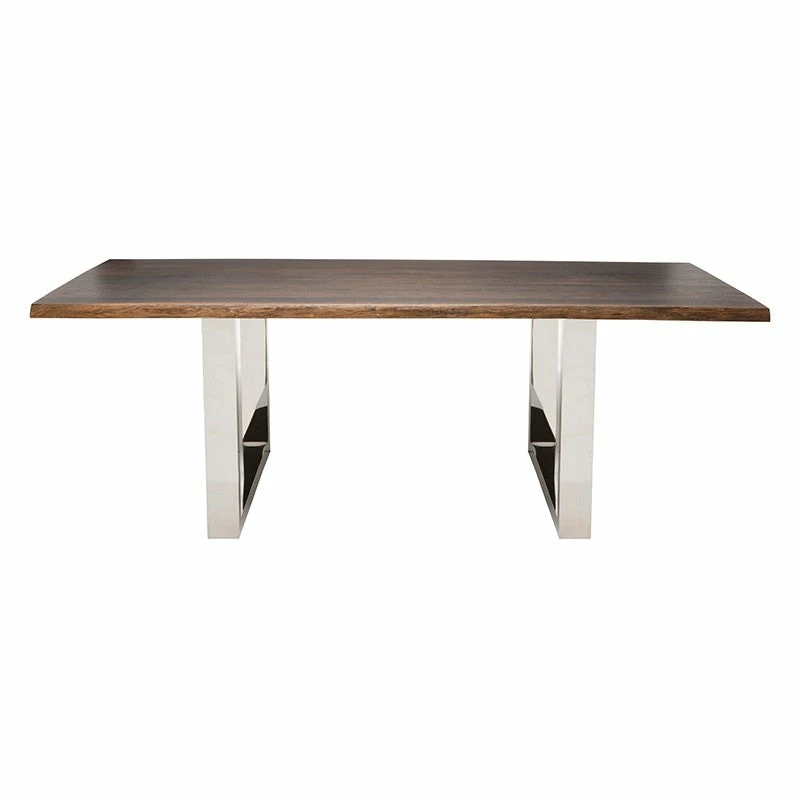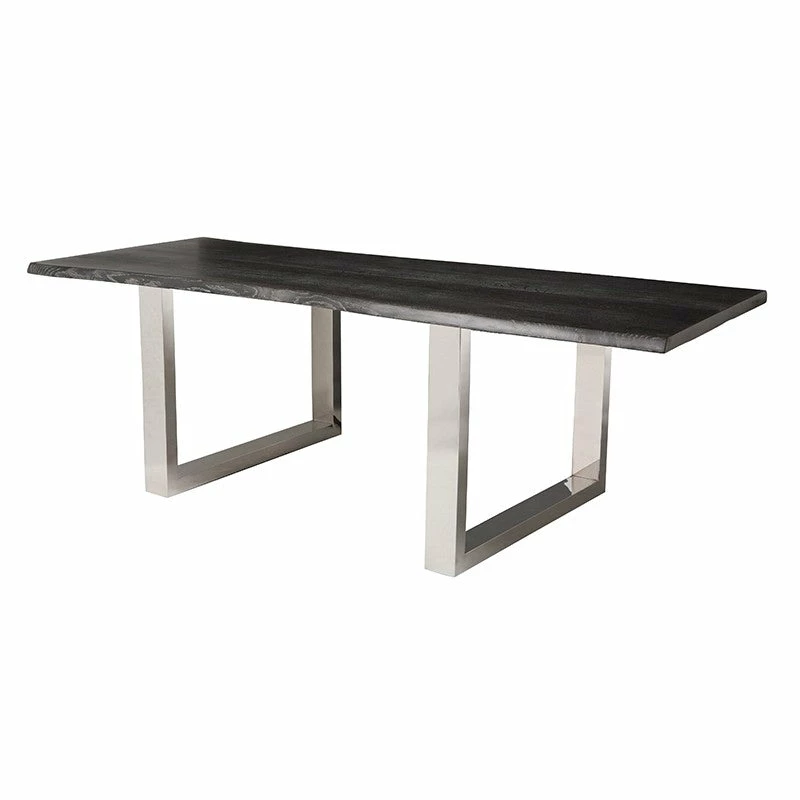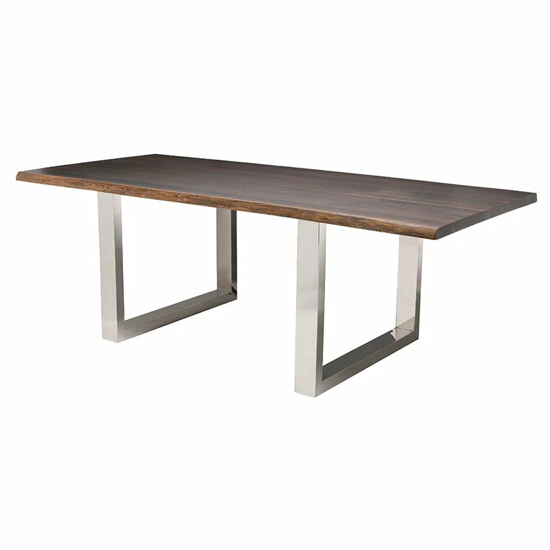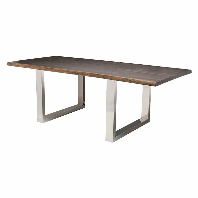 The Lyon dining table blends the current and traditional with inspired results. The principal material, solid live edge French oak rests on ultramodern high polish stainless steel legs. A bold contrast presenting a distinguished modern aesthetic.