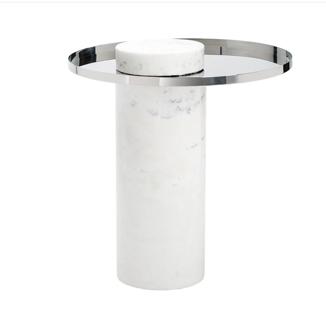 True to its name the Pillar side table consists of a cylindrical pillar of solid-marble supporting an elegant wrap around stainless-steel top. The innovative design presents a unique and compelling sculptural minimalism.
