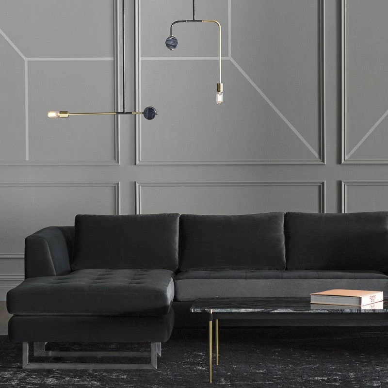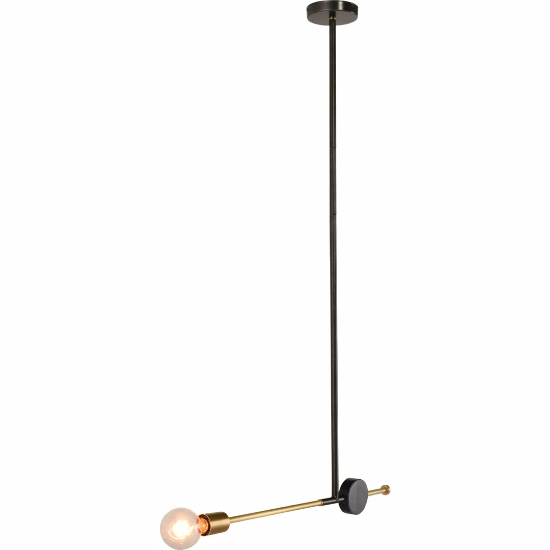 Structure meets flow. An elegant free form of mixed materials and design inspires a distinctively unique pendant. Mixed metals crafted in blackened steel and brass juxtapose an innovative marble counter balance bringing harmony to abstract linear form.