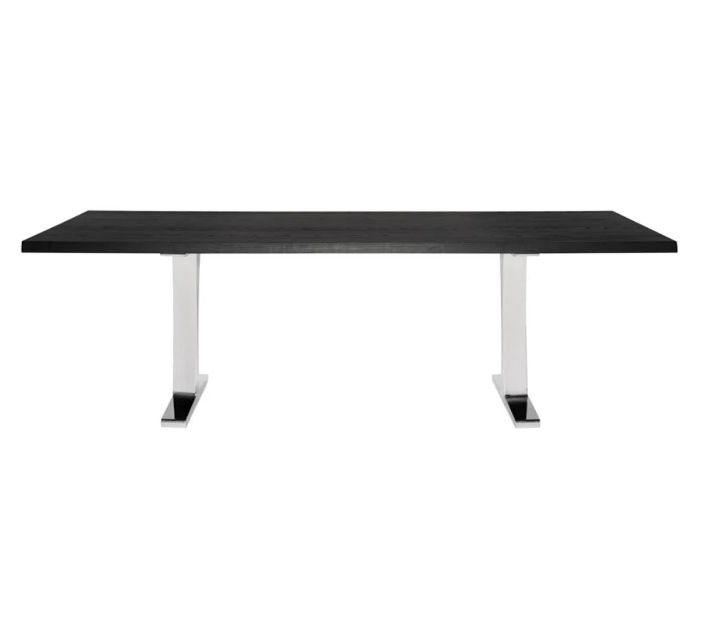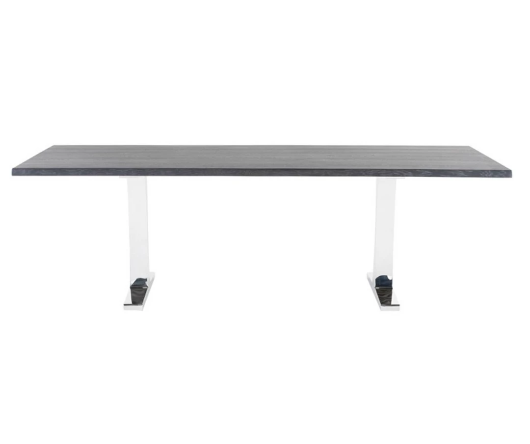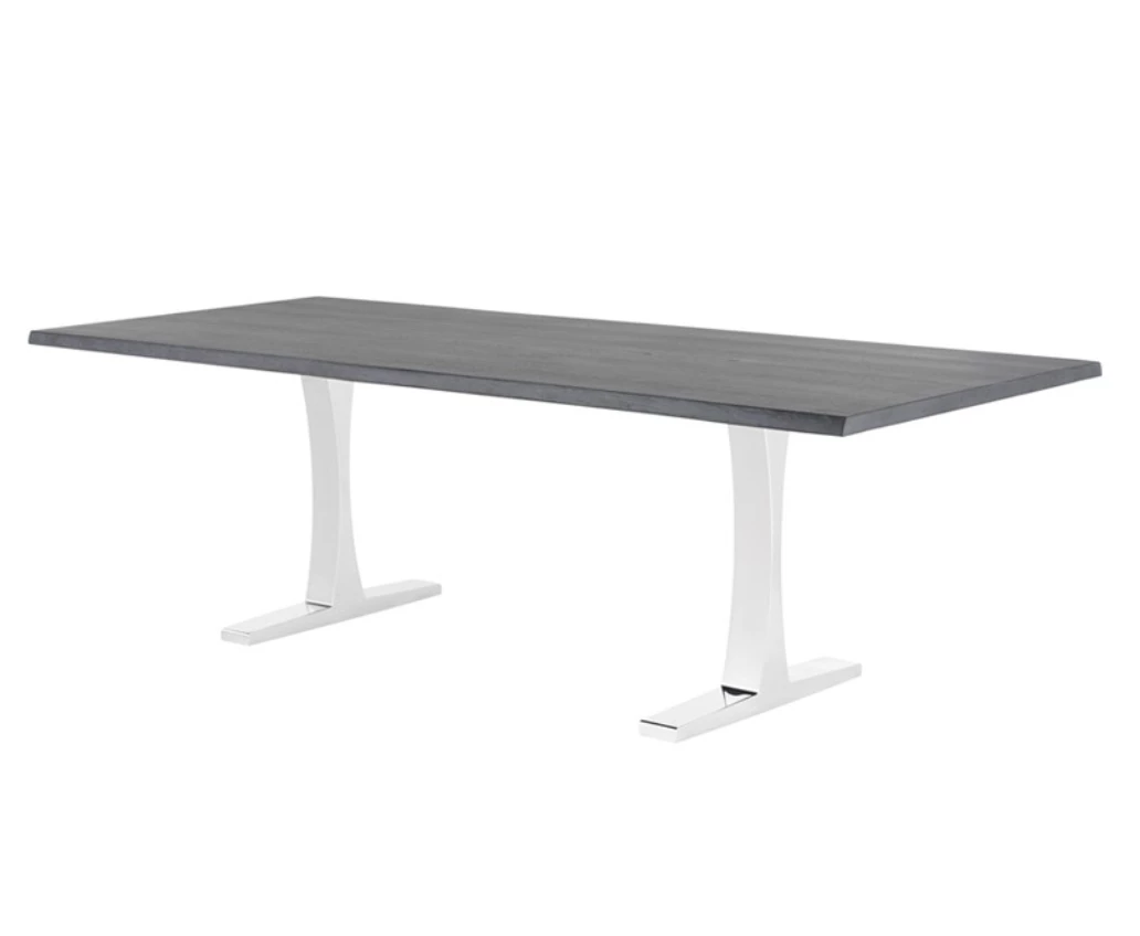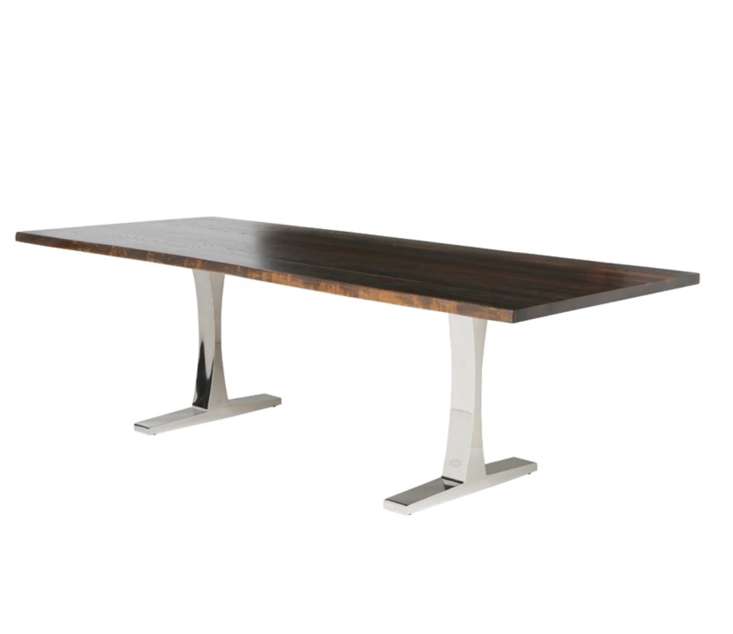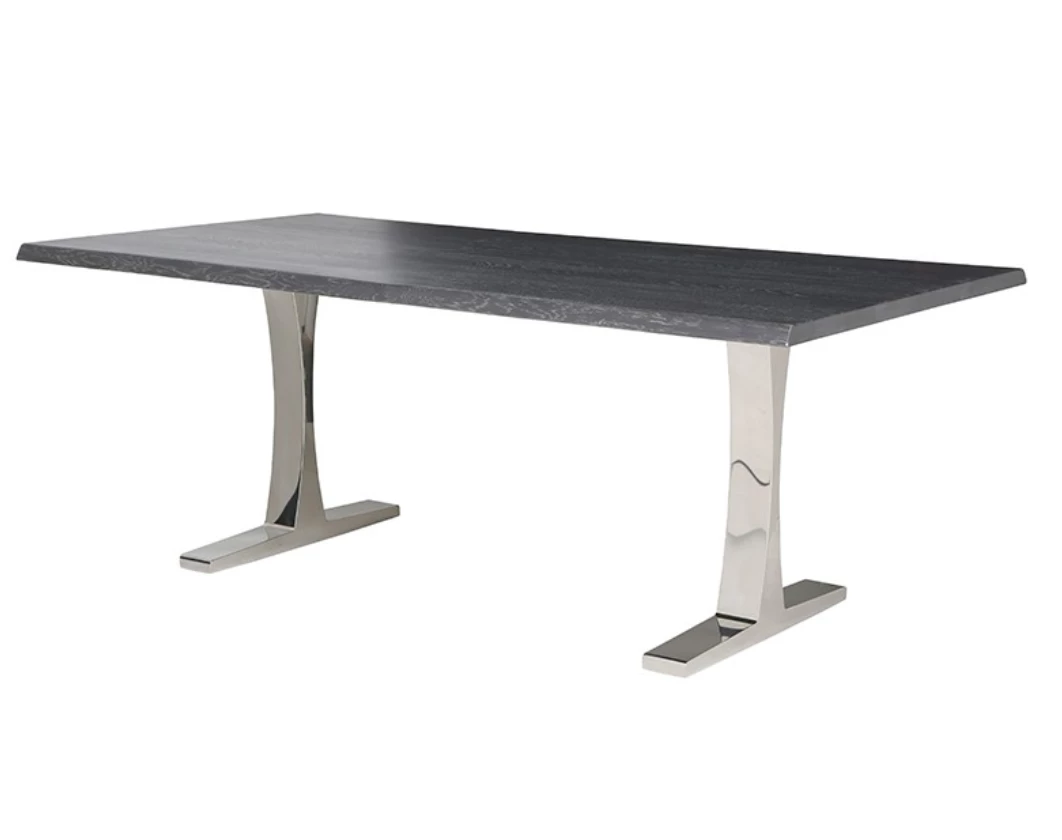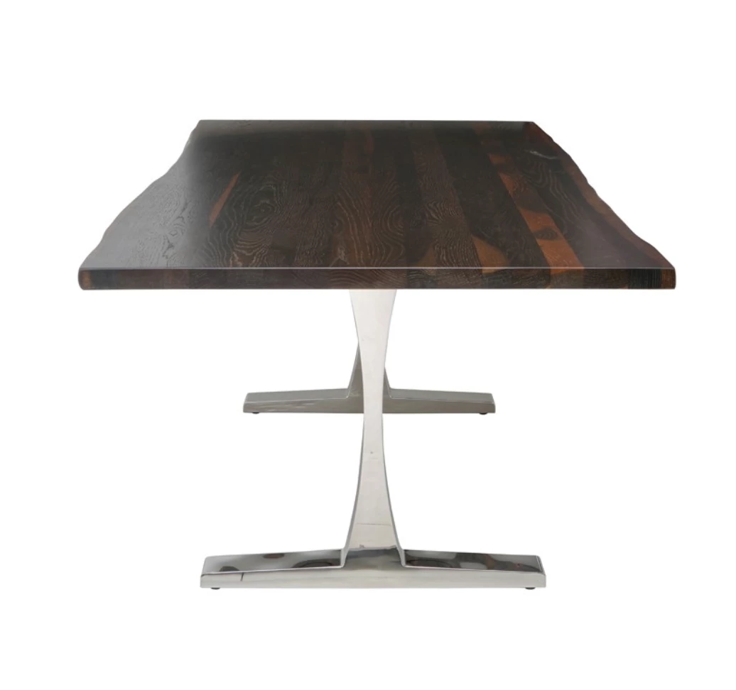 A study in contrasts, the oak and steel Toulouse dining table is both commanding and gracious. Brilliant beam legs in polished stainless steel anchor the Toulouse and support an expansive live edge solid oak tabletop. The Toulouse is available in 1? inch French oak with a live edge finish and double dovetail joinery.