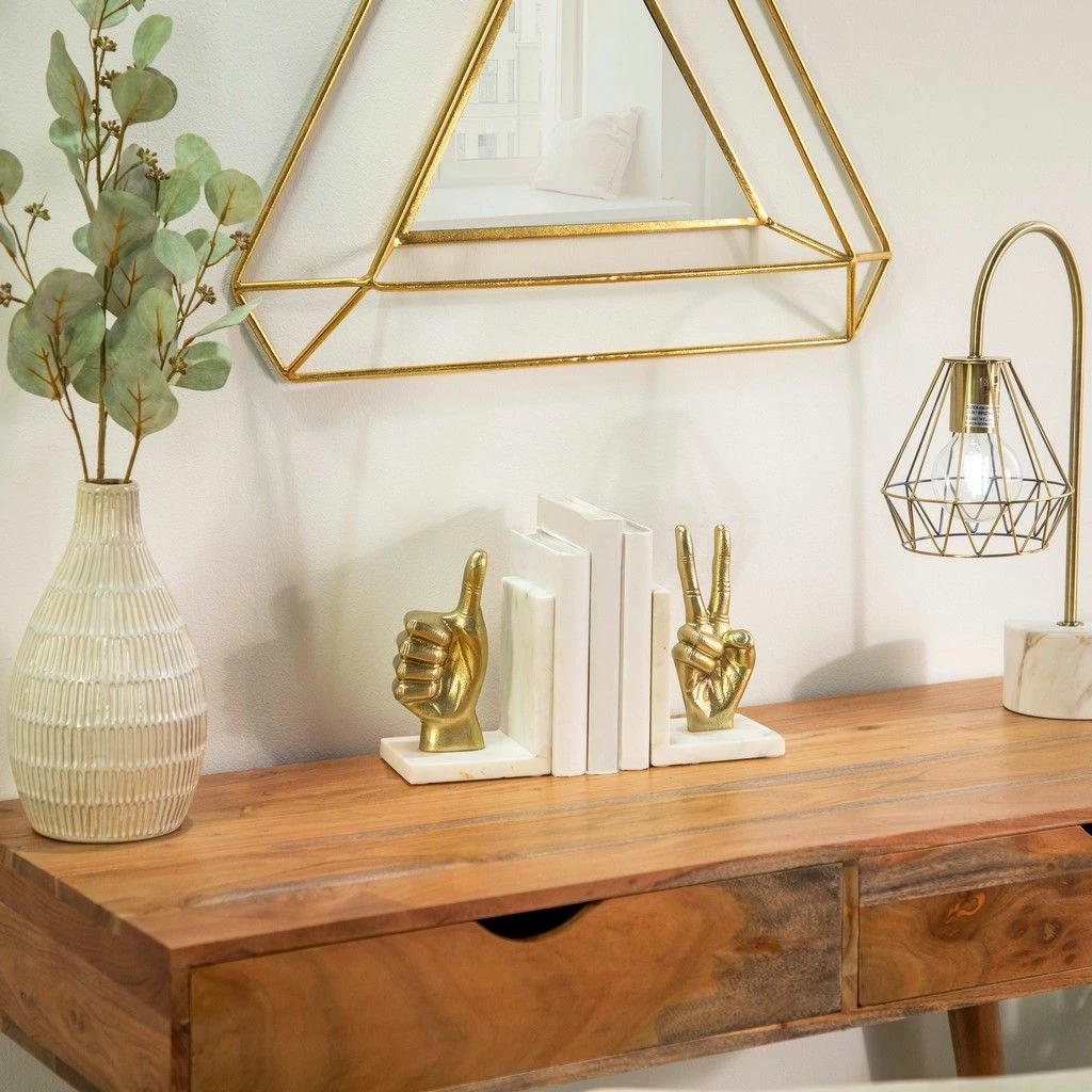 Aluminum decorative hand sign bookends; 1 peace sign, 1 thumbs up. Realistic detailing and textural finishes throughout each hand, this bold tabletop accent decor is sure to spark a conversation.
