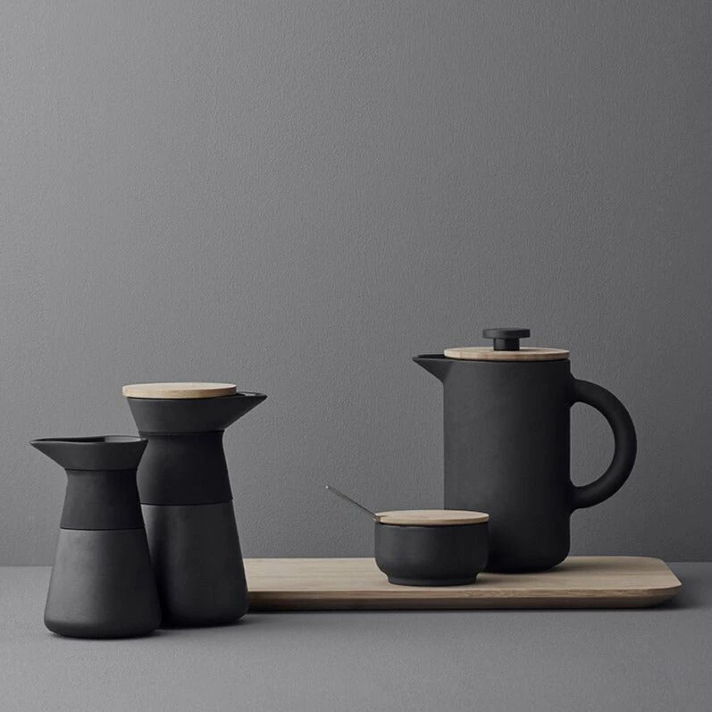 The sugar bowl from this collection is calming to the eye and the soul and combines Scandinavian design with a Japanese aesthetic in a sophisticated way. Made in matte black stoneware with a shiny glaze, the sugar bowl is both rustic and elegant. It comes with a bamboo lid, which adds a warm, tranquil touch.