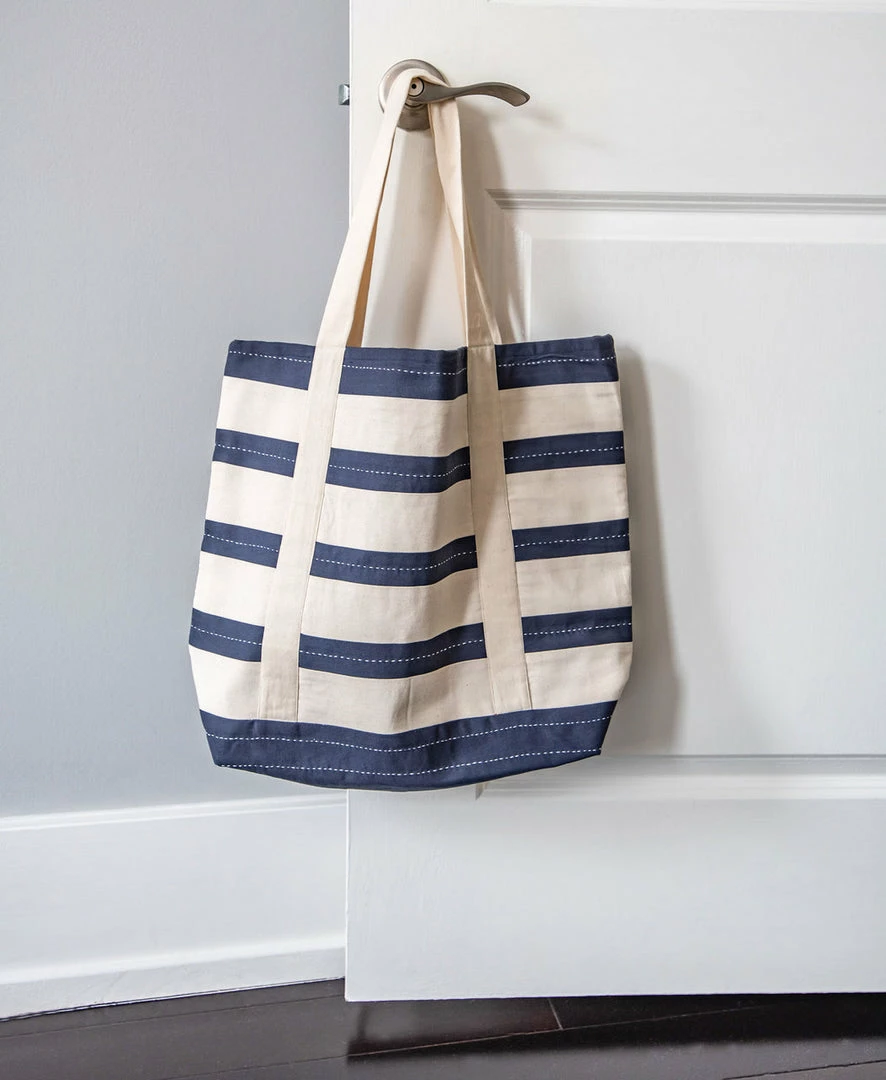 Our newest canvas tote bag is as versatile as it is functional. The delicate hand-embroidered kantha stitch adds a level of character and texture to the classic Americana stripe design. Constructed with a durable duck cotton canvas lining, this striped tote bag features both interior and exterior slip pockets to help better organize your most used items. From everyday errands to farmer’s markets, this bag is with you through all of life’s adventures.