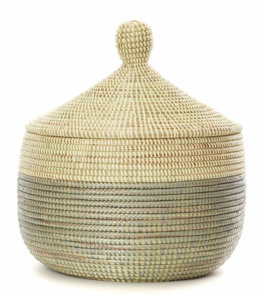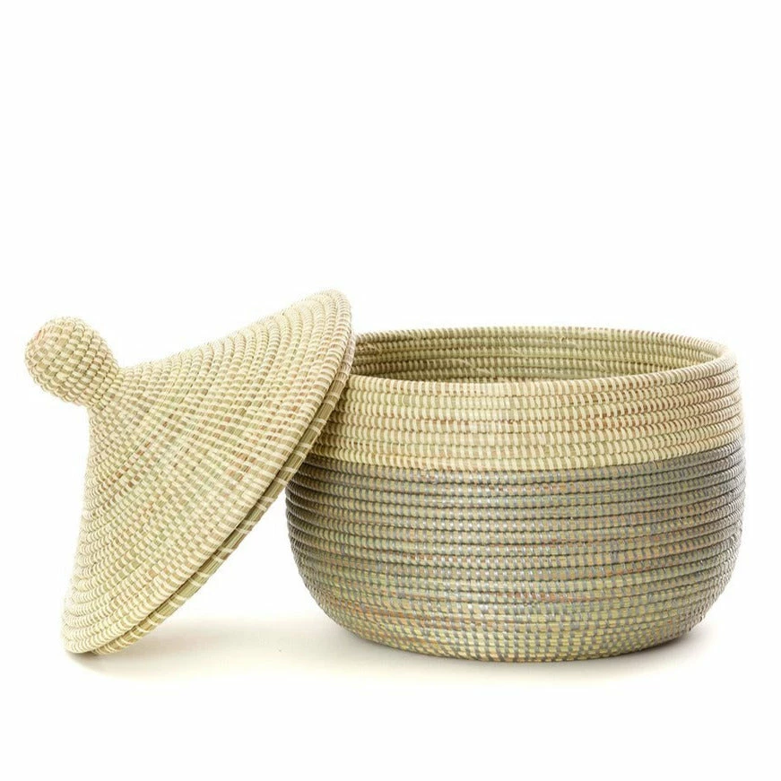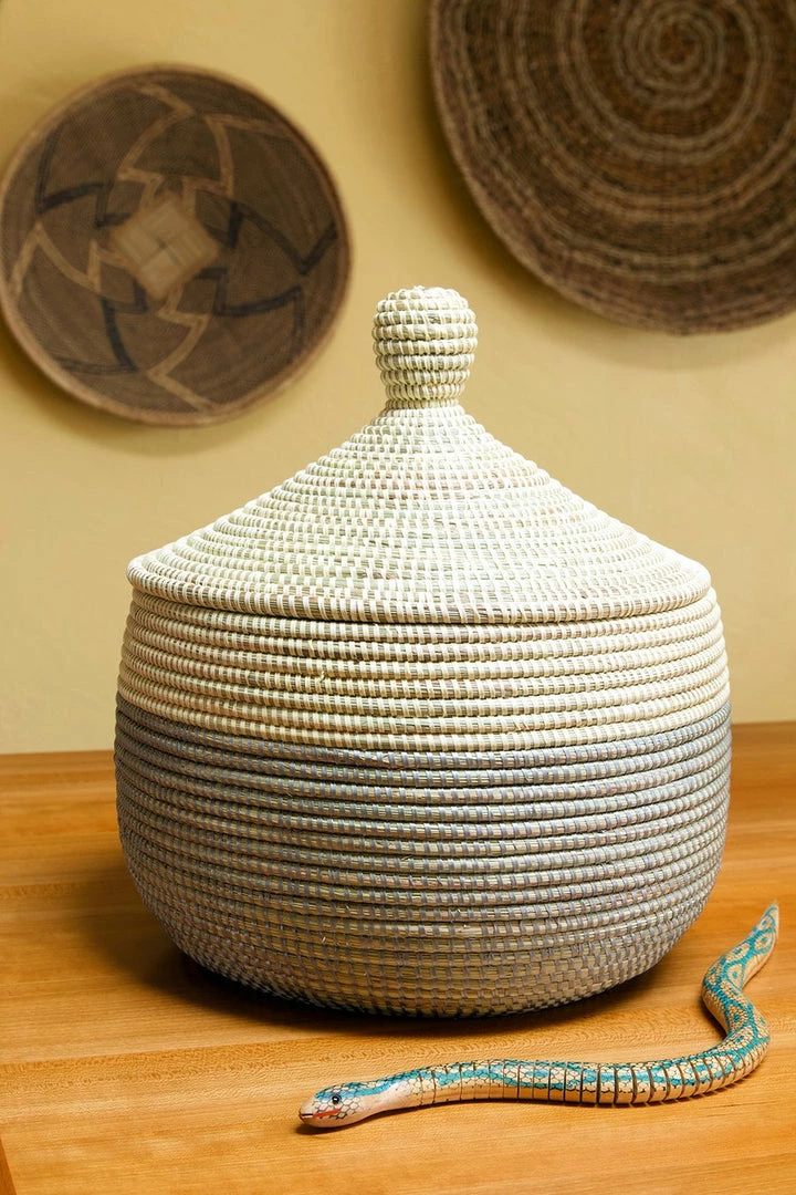 This beautiful basket is handcrafted by rural Wolof women in Senegal from cattail stalks and strips of salvaged plastic. With a snug fitting lid, our warming baskets are a perfect way to present baked goods to loved ones, or to create a memorable gift basket of your own design.