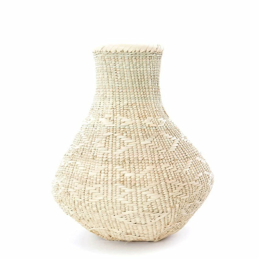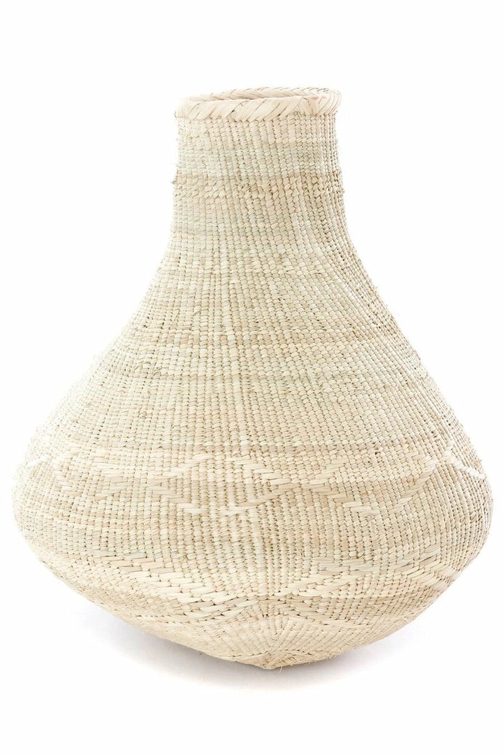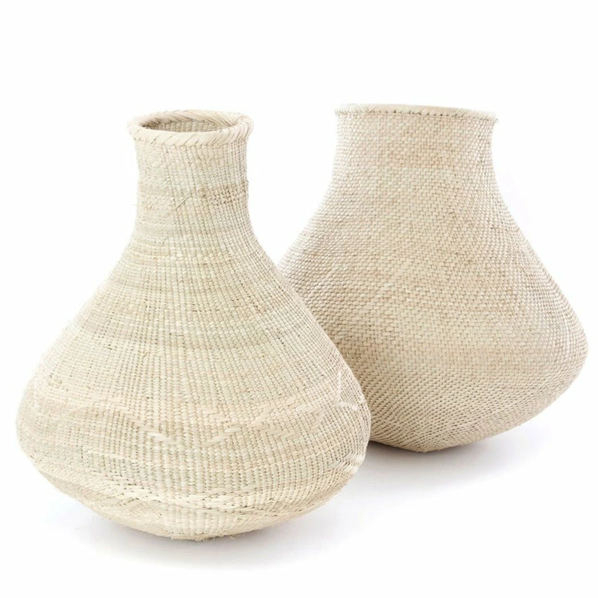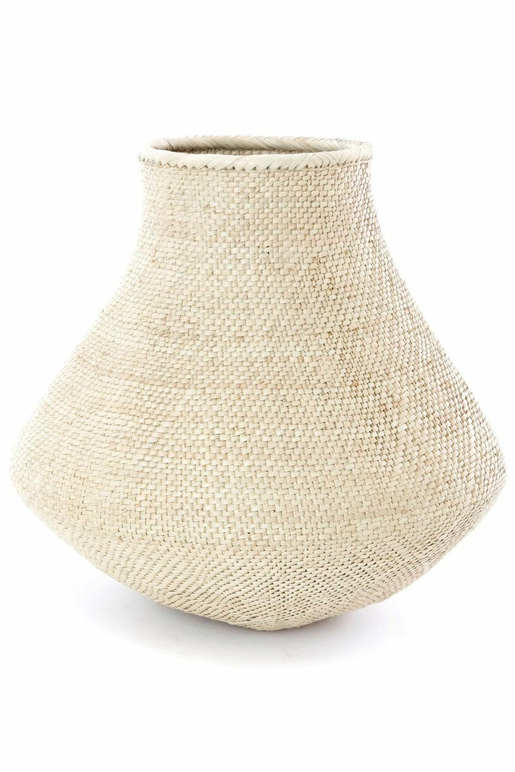 In the Binga District of northern Zimbabwe, skilled BaTonga women craft these iconic baskets from locally harvested palm leaves and wild twigs. Shaped like calabash gourds, each basket has a one-of-a-kind shape. The BaTonga people once farmed fertile land that was flooded by the damming of Lake Karibu, so weavers displaced across the lake demonstrate similar yet clearly distinctive styles.