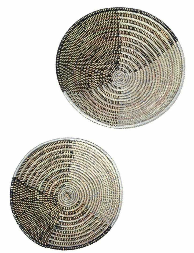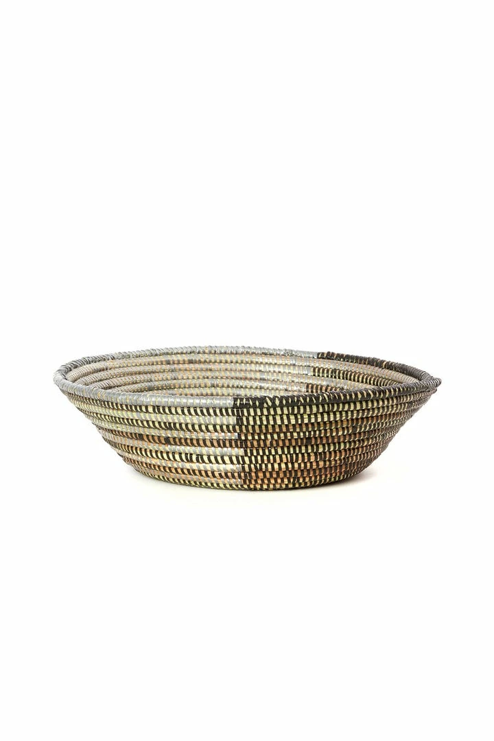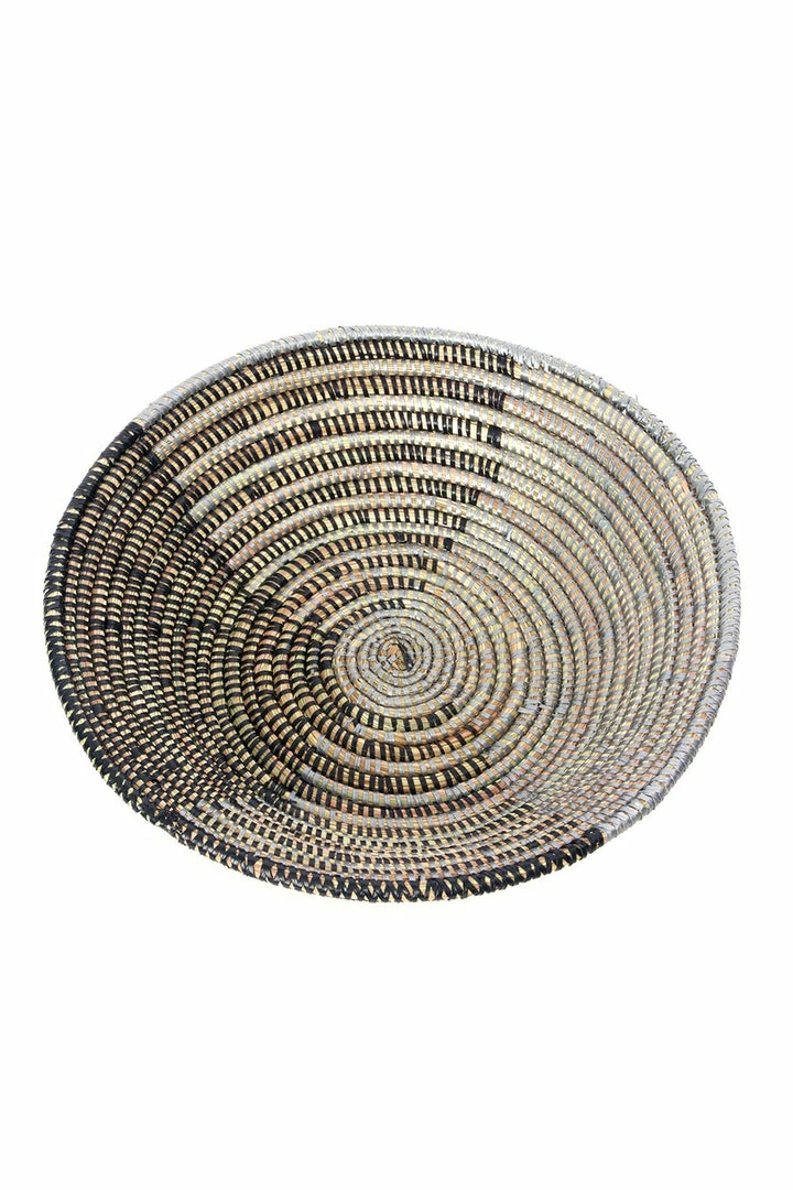 Basket weavers in rural Senegal transform abundant cattail stalks and salvaged plastic strands to create useful tabletop baskets with a unique triangle quadrant design.
