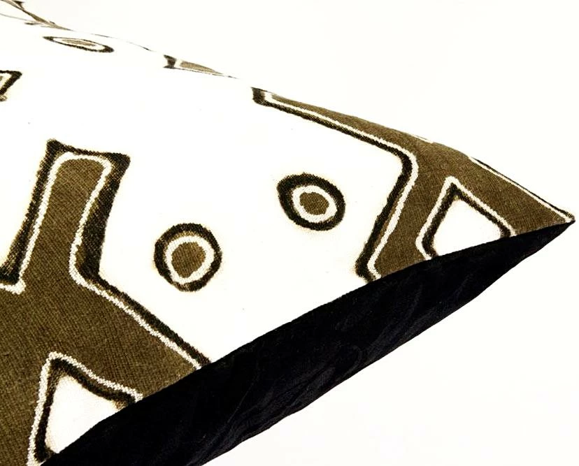 Malian artisans highlight an isolated graphic element from mudcloth textiles in this bold duo-tone pillow. From the woven cotton panel to the hand painted dyed designs, this beautiful decorative accent demonstrates traditional crafting skills updated for the modern home.