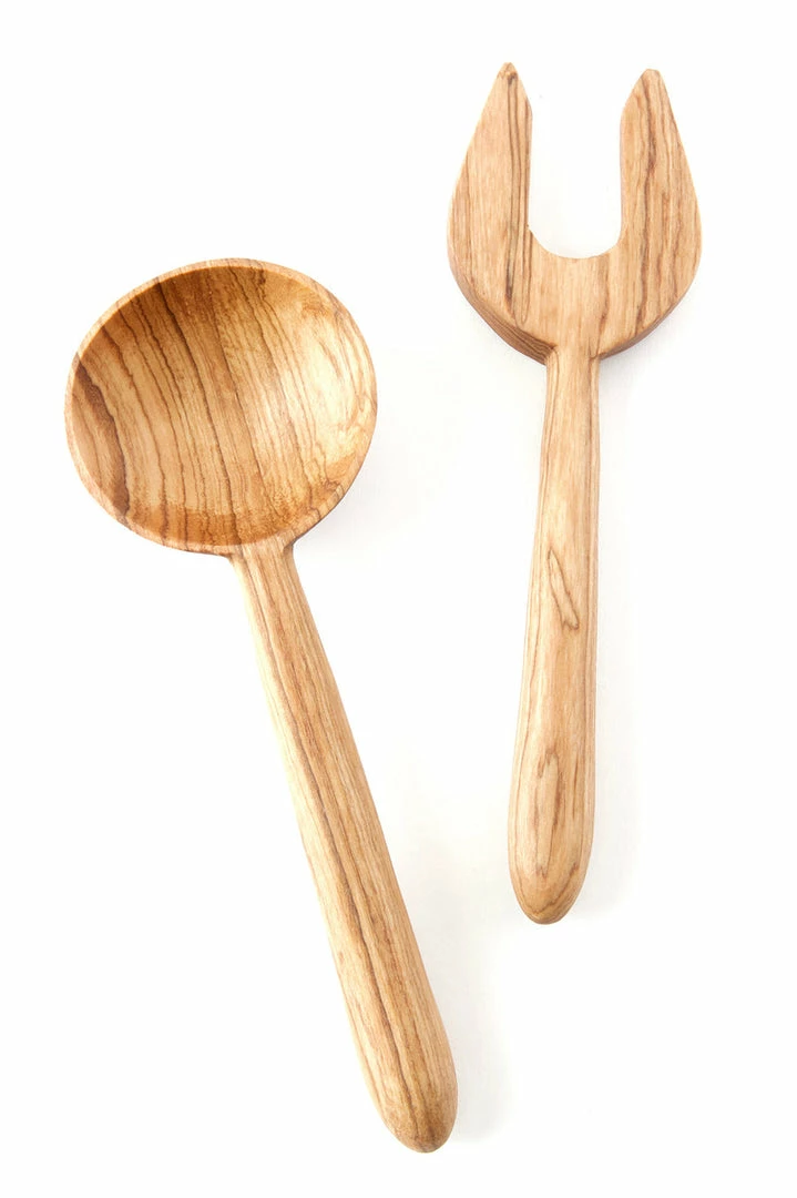 Kenyan carvers transform beautifully grained wild olive wood to create this uniquely styled set of salad servers. The spoon features a lovely rounded bowl, and the fork’s head is carved in the shape of a bident.