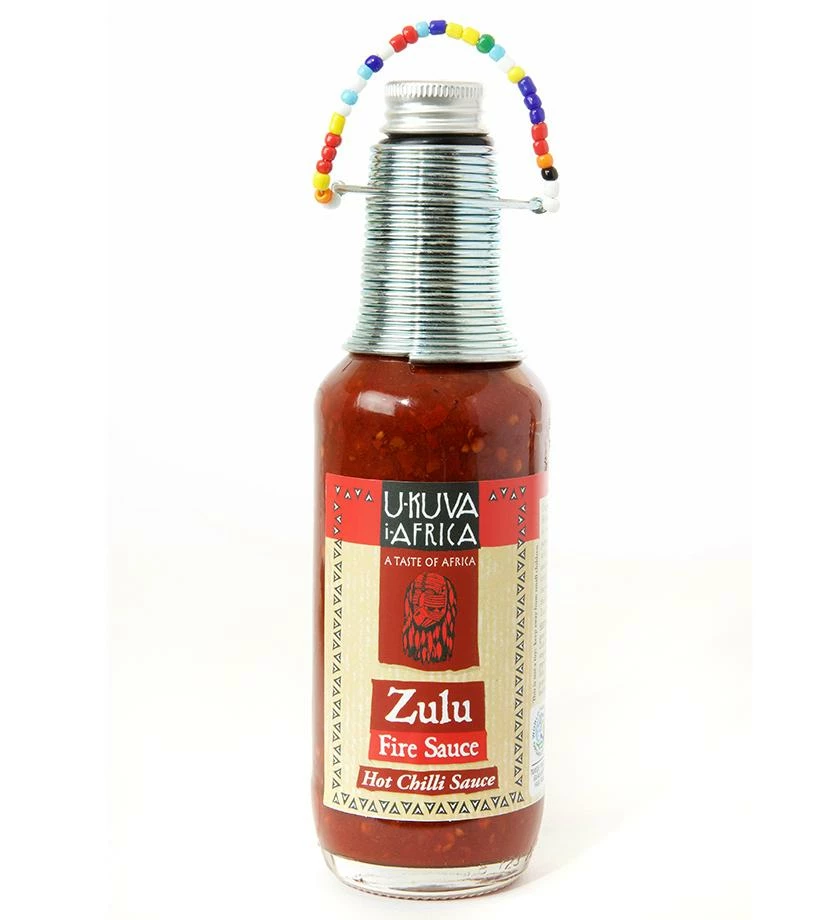 Zulu Fire Sauce is a moderately hot red chili sauce with great body and exceptional depth of rich flavor. Pairing well with dark proteins and tomato-based dishes, the brilliantly colored sauce can be used to marinate proteins, or stir-fried with vegetables. Carefully assembled small batches are presented in beautifully adorned bottles that tell how each sauce was inspired. The delicious sauces can be used as a marinade or finishing sauce and can be used in Uvuka’s collection of recipes.