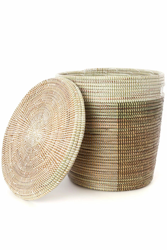 This stylish African basket is woven from cattail stalks and strips of plastic by rural women in Senegal, West Africa. This adaptable basket features cut-out handles, a flat lid, and a unique half & half pattern. When placed against a wall, the basket can show only one of the two colors, or both!