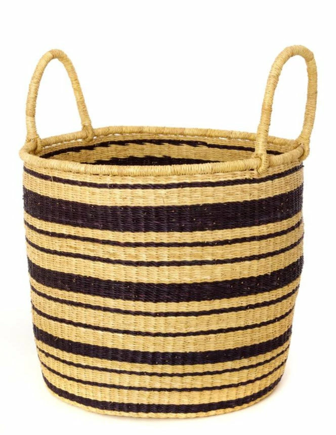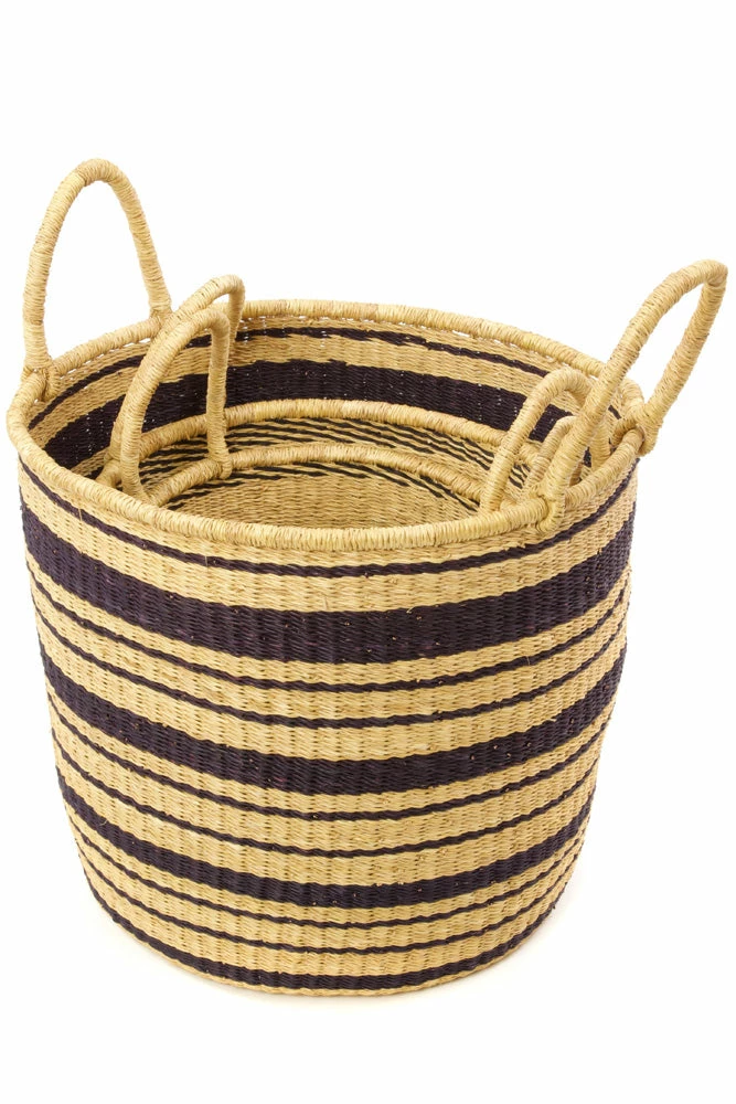 Basket weavers in Ghana, West Africa, create a set of beautiful and useful deep hamper baskets from tough elephant grass. With short handles on each side, these striped storage baskets are designed to be useful in any room of the home.