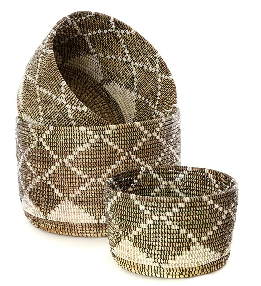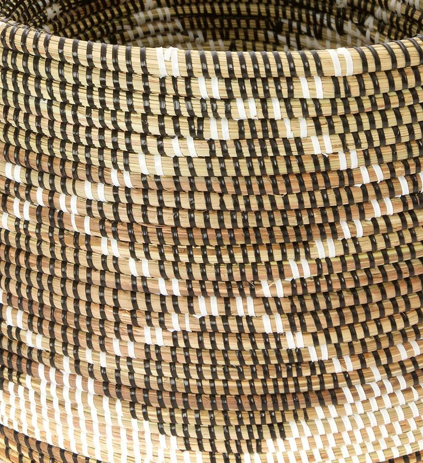 These modern African baskets is woven using black and cream recycled plastic strands coiled around cattail stalks to form a criss cross pattern. This set will provide stylish storage for any room in the house.
