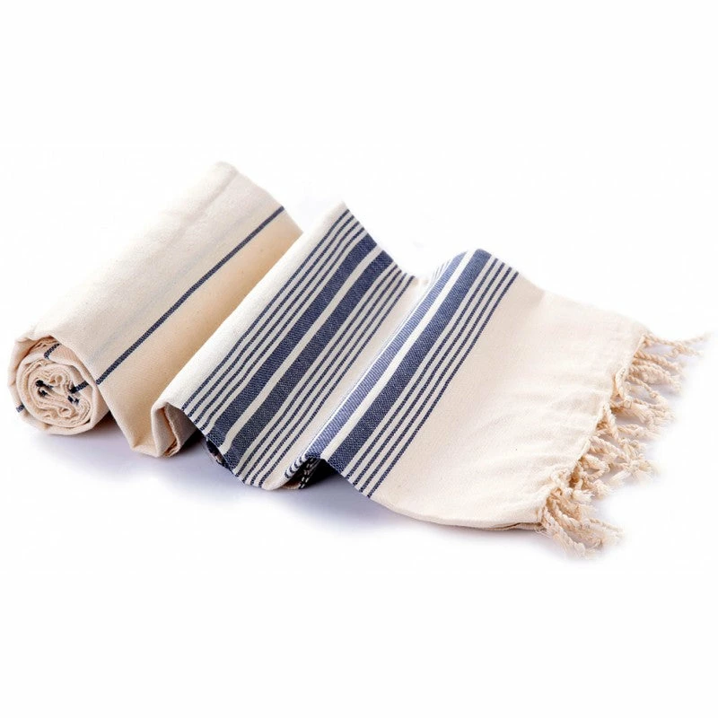 The ecru color Peshtemal Towel decorated with thin and thick dark blue stripes. Here’s a real classic of Turkey. The Turkish bath towel, made of hundred percent natural cotton fibers is woven on hand looms.