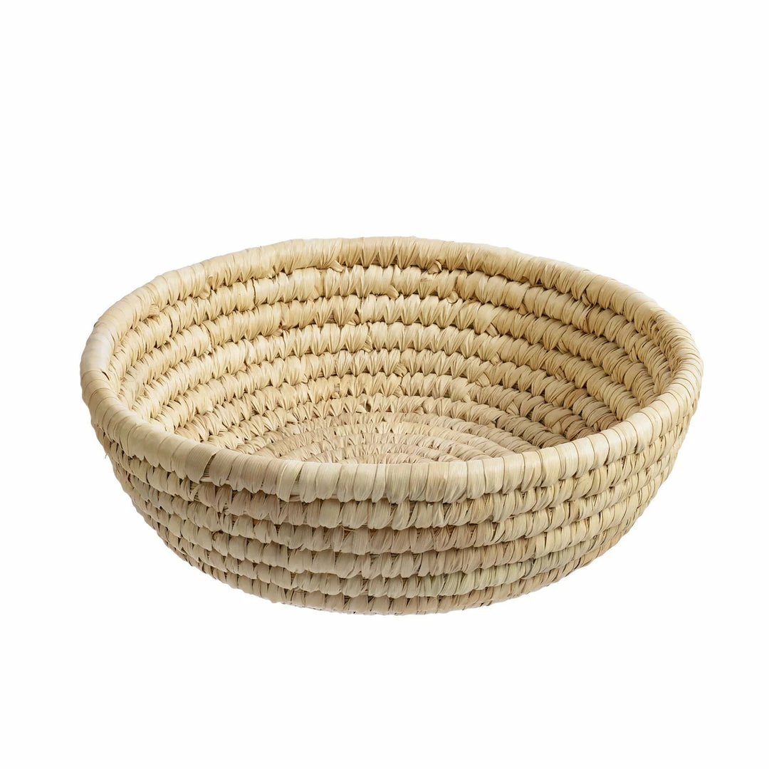 Woven from sun bleached date palm leaves, Bryn baskets will patina to a mellow cream color over time. Their bundled sea grass core lends them exceptional strength. Clean with a damp cloth.