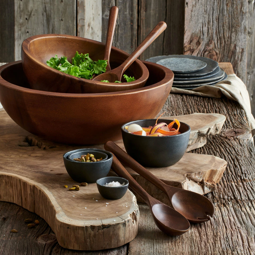 Skilled artisans from Indonesia spin-carve these pieces from sustainably harvested suar wood. Ideal for offering hors d’ouevres at your next party or displaying a festive collection of candles. Each is coated with a thin layer of beeswax to create a satin-soft food-safe finish. Due to natural variation, each piece is uniquely yours. Stack the pedestals for a more dramatic presentation. Wipe clean with a damp cloth.