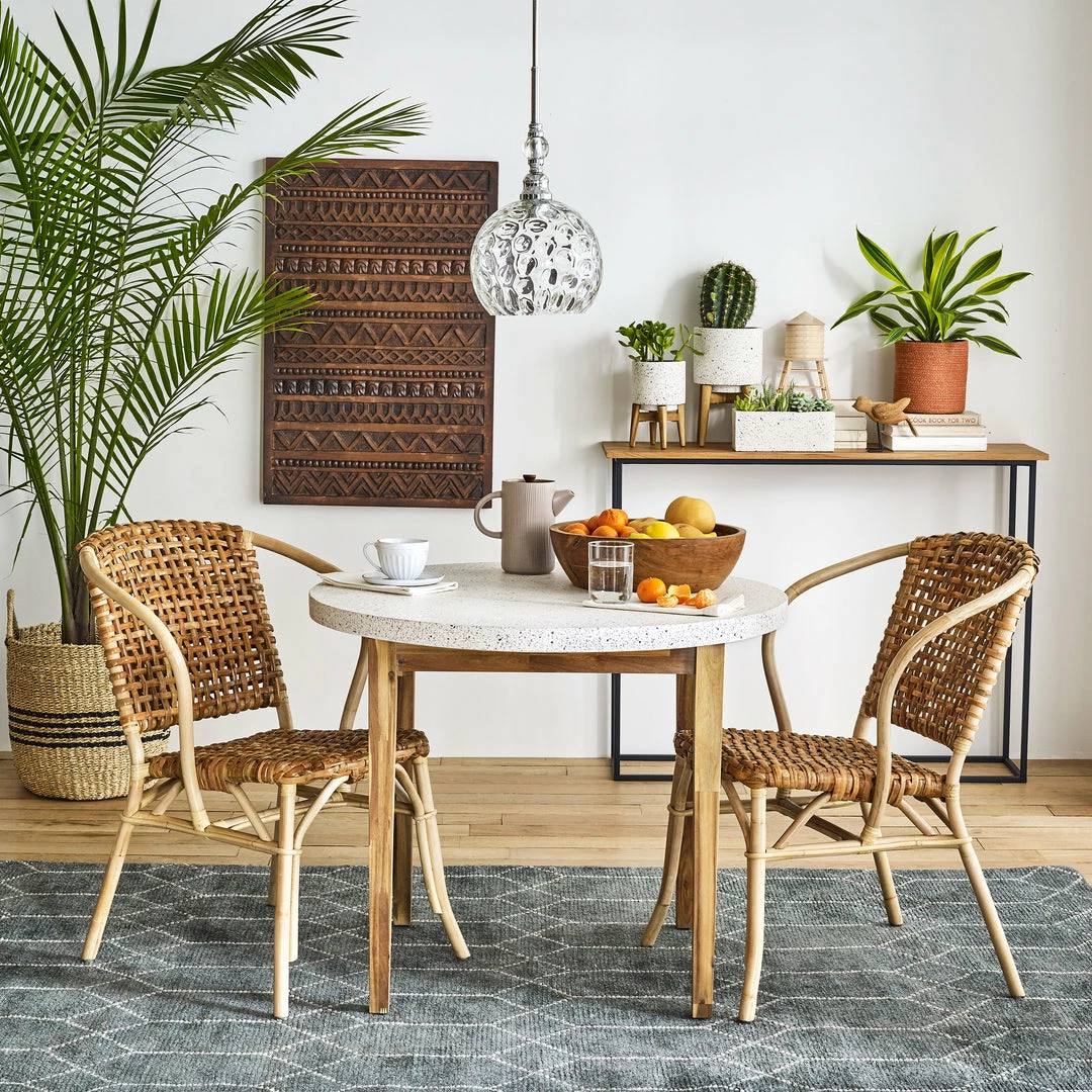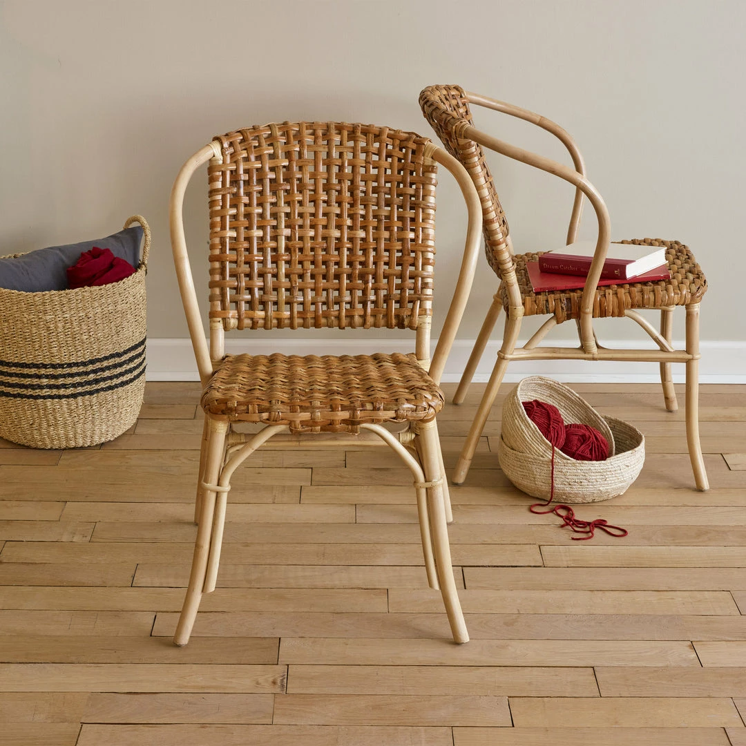 We use the outer peel of large diameter rattan to weave the seat and back of our Lilas chair. When rattan reaches this size it achieves steel-like durability but retains the flexibility of a supportive cushion. Modeled on European café chairs, Lilas will bring a frisson of continental romance to any dinner setting or breakfast nook. The chair features all-rattan construction and is stackable for storage.