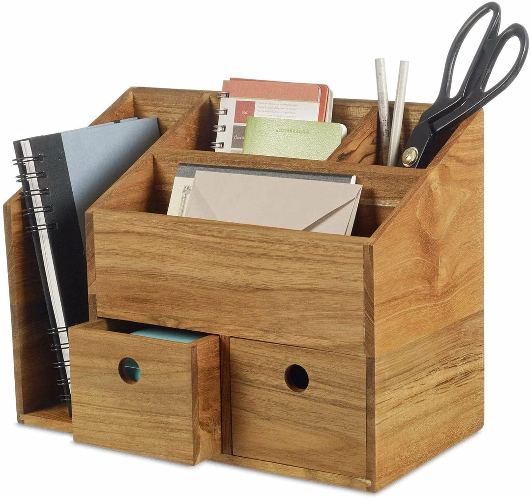 Clean lines and natural aesthetics mingle to bring your workspace to the next level with our Takara desk collection. Made of smooth sanded golden-toned teak wood, each Takara Desk Organizer is expertly crafted with six separate compartments for organizing writing utensils, note pads, journals and mail on your desk or countertop. Two sliding drawers conceal clutter, while a slot for taller notebooks and catalogs and three divided compartments offer easy access. Alternatively, use in the bath or vanity to organize makeup brushes, palettes and other essentials. Use caution when leaving on a porous or fabric surface for an extended period, as the wood may release oil over time. To remove oil stains from surfaces, we recommend using a mixture of equal parts baking soda and toothpaste and wiping with a soft clean sponge and warm water (always test surface for damage and colorfastness before cleaning).