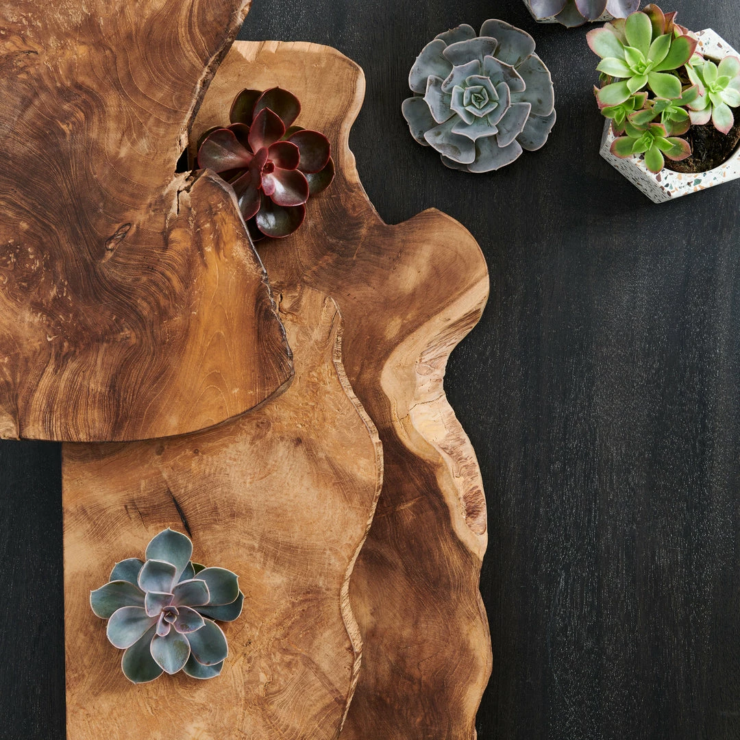 Our Takara shelves reclaim the enormous roots from felled teak trees that would otherwise be burned. Skilled artisans then craft the gnarly wood into useful articles with curves and edges only nature could devise. Sizes are roughly similar, but every piece is unique.