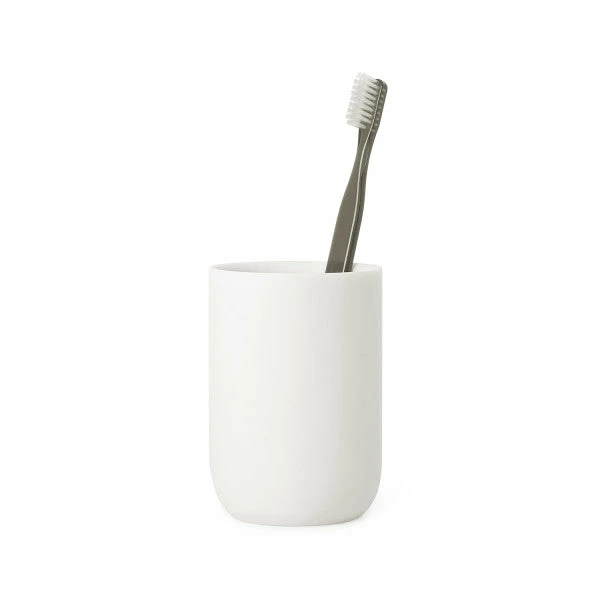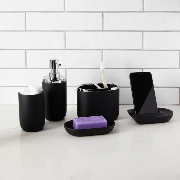 A modern, resin bathroom tumbler, part of an apothecary-inspired bath collection. Introducing the Junip Tumbler by Umbra x Gensler. This tumbler and the other pieces in the Junip collection were inspired by apothecary bottles and have a weighted look, with rounded lines. The tumbler is made of resin and has a matte, black finish, that feels like the surface of a smooth pebble. A great accessory for your tooth brushing routine, this modern bath tumbler measures 2¾ x 2¾ x 4 inches. Junip’s amenity tray functions as a modern take on the apothecary shelf and can be used to house the collection’s canister, soap dish and phone holder. A Leisurely and Elegant Collection: The accessories in this line co-ordinate beautifully with each other, featuring the same finish and lines, but different proportions, creating a casual, chic vibe for your washroom. Order the Junip tumbler today for a sleek and refreshing bathroom accessory update. About Umbra:A global product design company providing original, modern, casual, and functional design for the home.