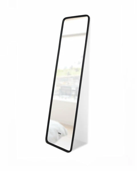 When decorating your space, it is often difficult to find a mirror that is modern, light-weight and large in size. Full-length mirrors can be heavy, over-sized and super delicate. Introducing the HUB LEANING MIRROR from Umbra This full-length mirror can be mounted on or leaned up against the wall to fit your desired space. Its rubber frame adds a modern touch and acts as a bumper to make this mirror durable and great to place in busy areas of your home. Designed to be slim in size, the Hub Leaning Mirror can also be placed in a variety of small or awkward spaces and is easy to move around. With its large and reflective surface, this mirror works to brighten a room, tricking the eye into making space appear larger. For an impactful and versatile mirror, order Hub from Umbra today.