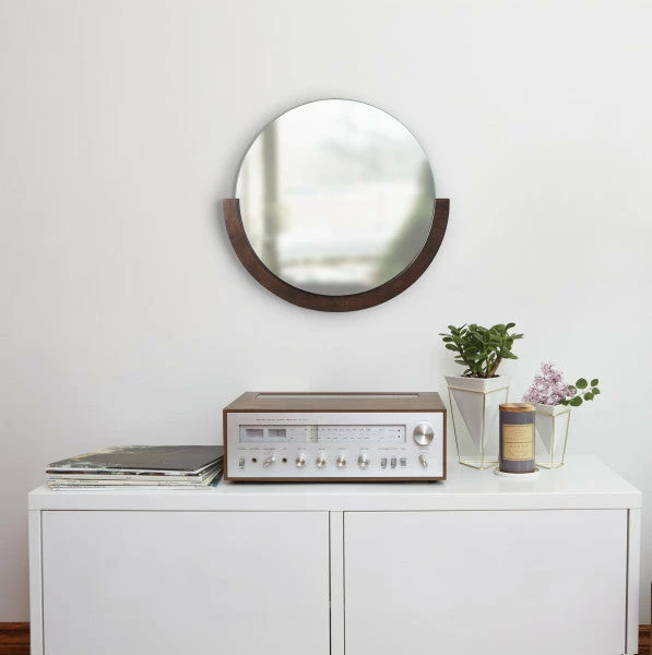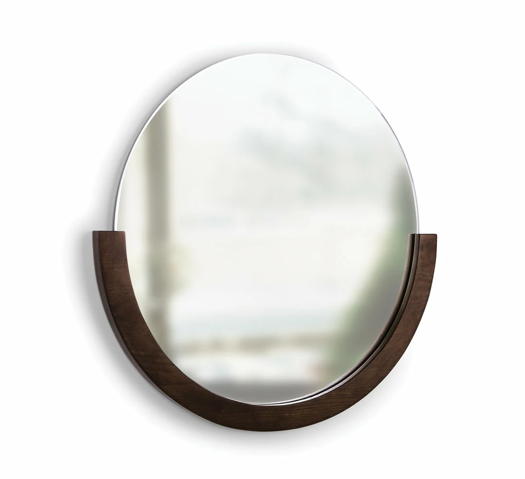 If you’re looking for a contemporary yet warm and welcoming mirror, Mira may be the ideal piece of wall decor for your home. This circular mirror has a wooden semi-circle frame with a warm wood finish. If you are looking to make a room appear larger, this mirror will aid in tricking the eye, as it helps bounce light around the room with ease. The top half of this circular mirror is frameless, enhancing its ability to add to the decor of the room without adding a lot of weight to the wall. This versatile mirror looks great as a powder room mirror, in entryways and bedrooms. Mira also makes an excellent housewarming gift as it suites multiple decors.