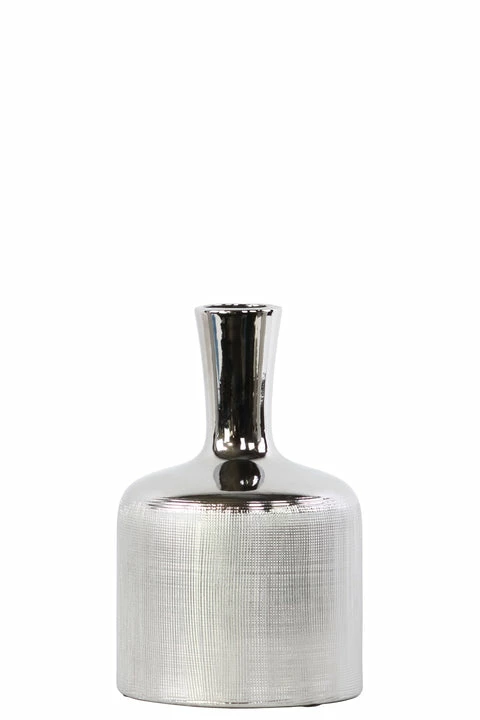 Ceramic Round Bottle Vase with Engraved Criss Cross Designed Body and Smooth Neck MD Polished Chrome Finish Silver