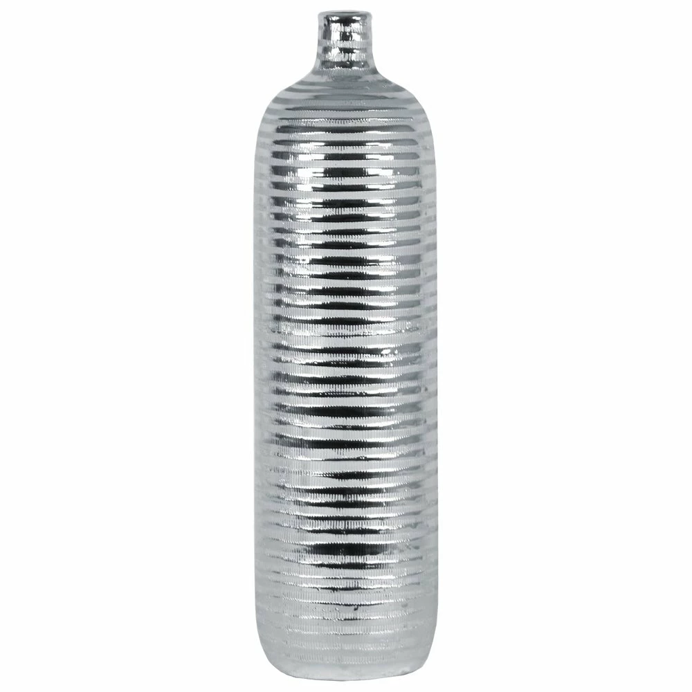 Ceramic round vase with narrow neck, coated and etched line finish.