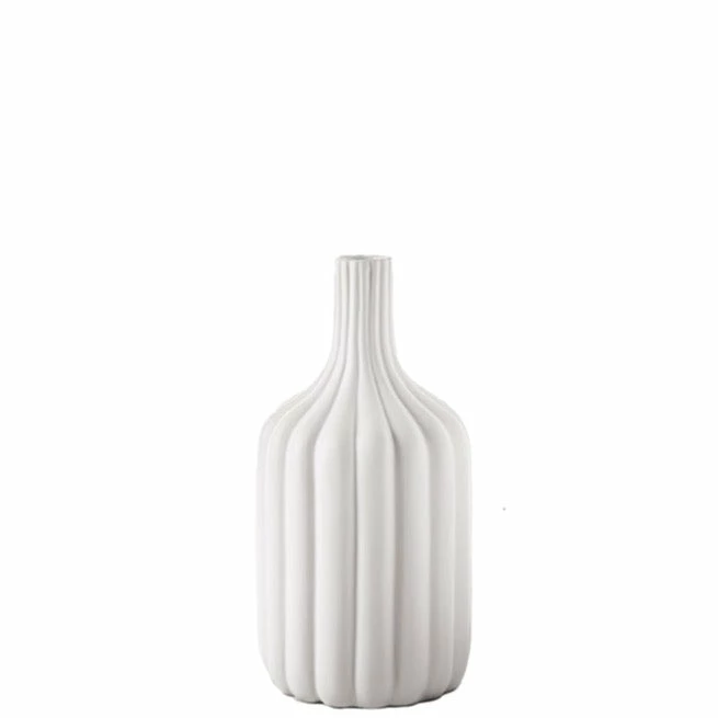 Ceramic Round Bottle Vase with Narrow Mouth and Embossed Column Pattern Design Matte Finish White
