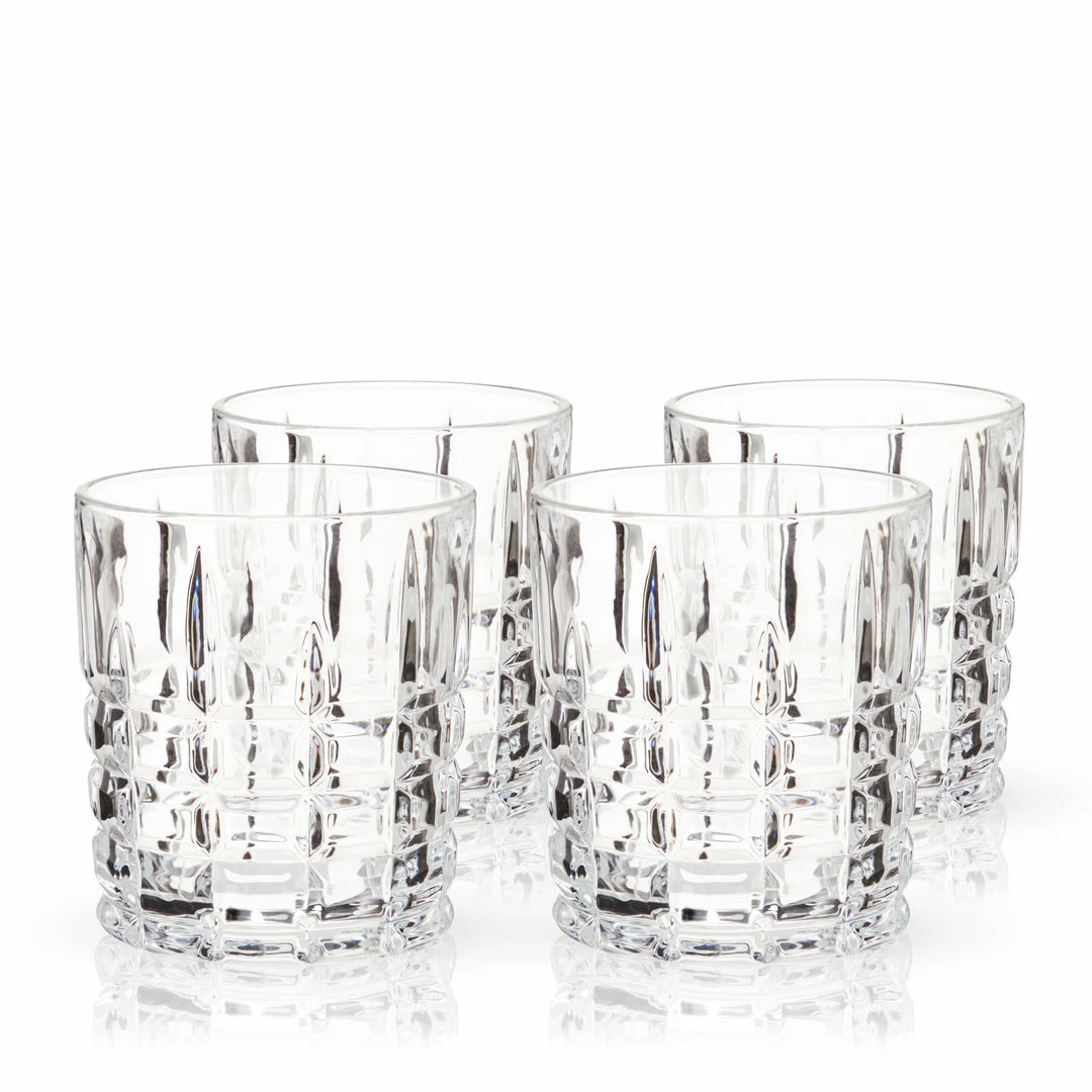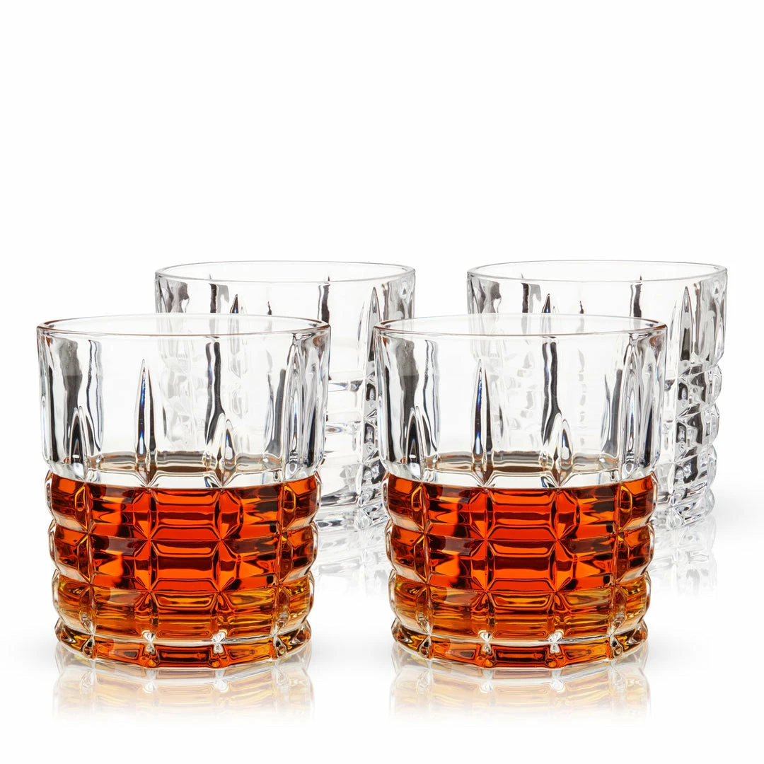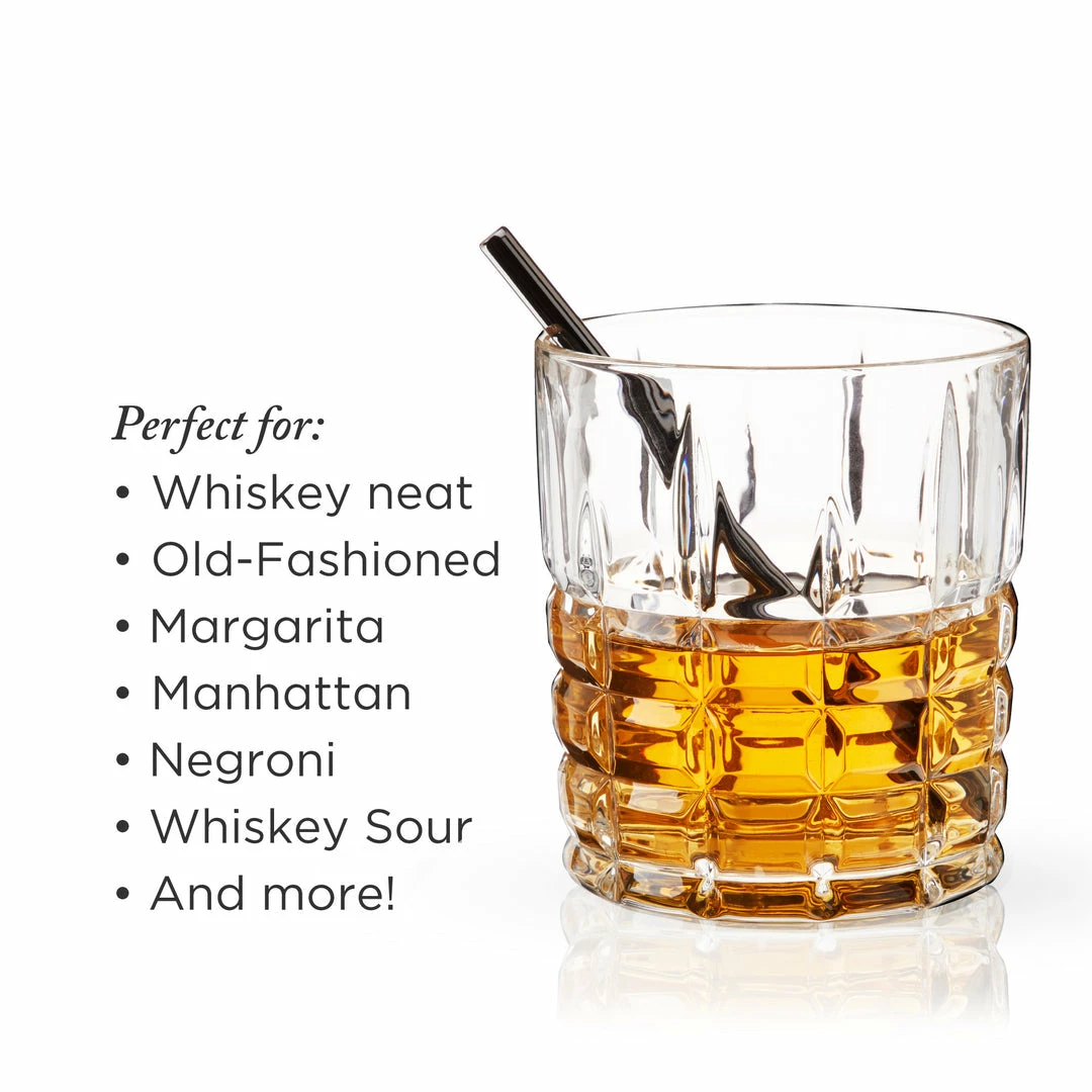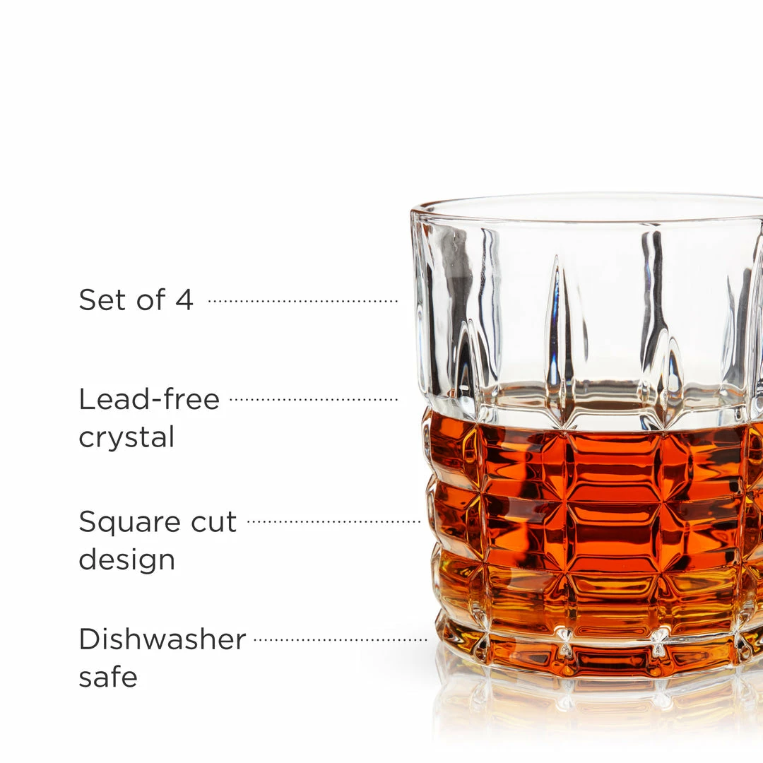 Crisp square-cut facets make these crystal Double Old Fashioned glasses a pleasant blend of contemporary and traditional. Perfect for cocktails or a neat pour of Scotch.